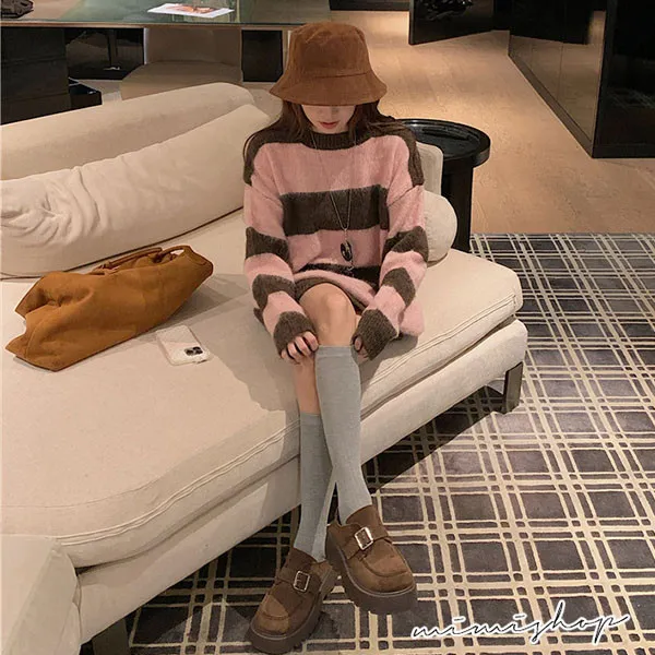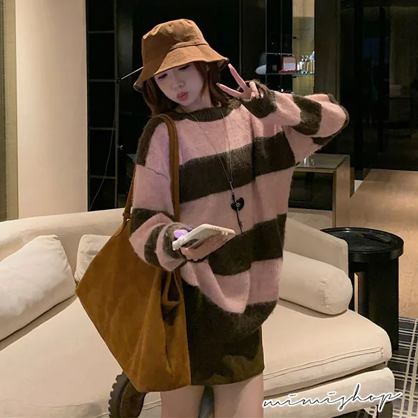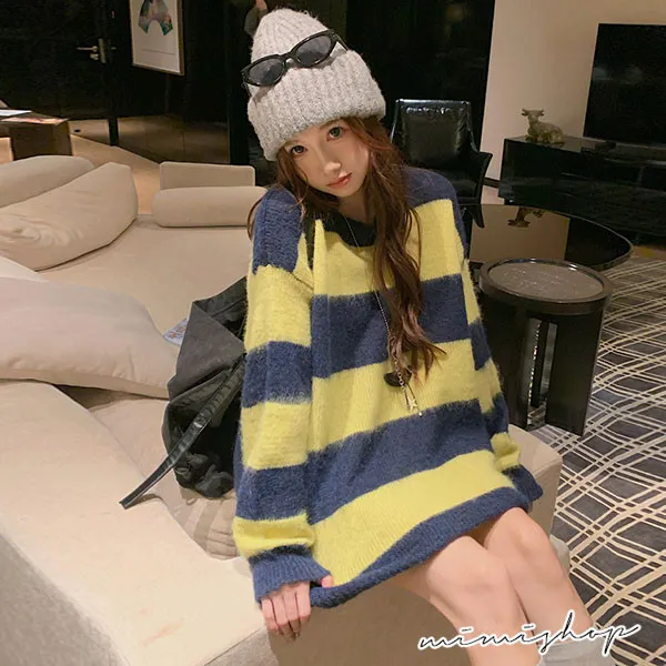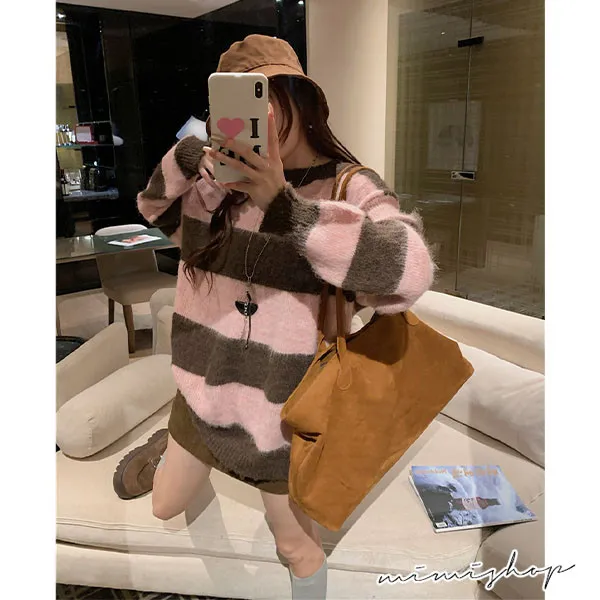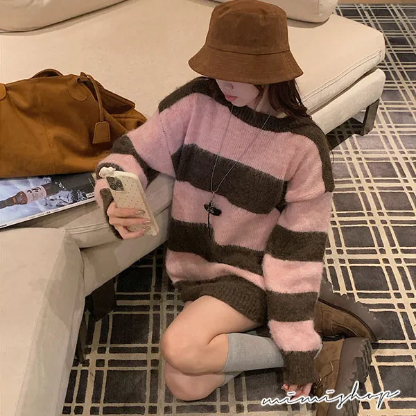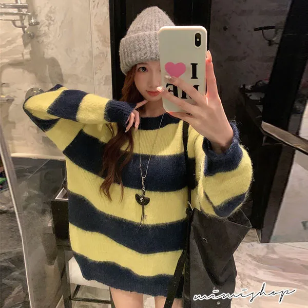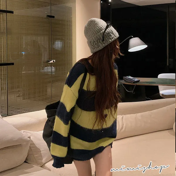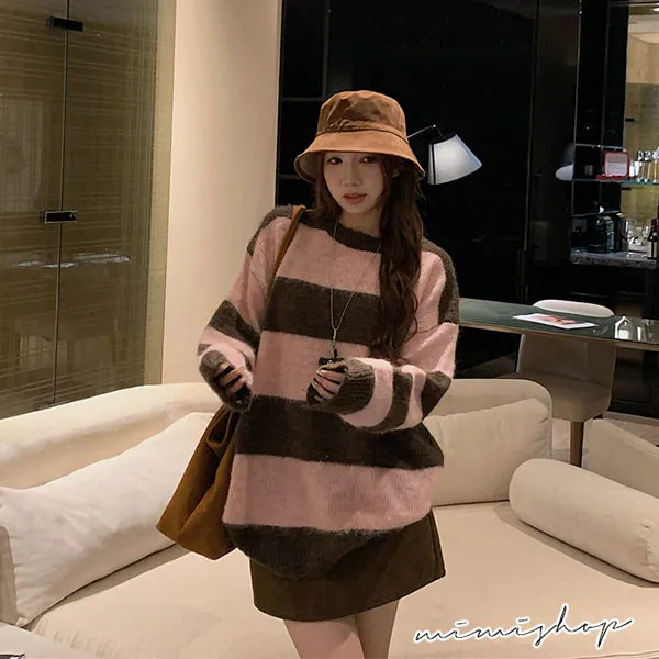 【P511336】率性甜美 寬鬆撞色條紋針織衫 百搭毛衣