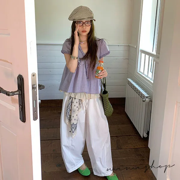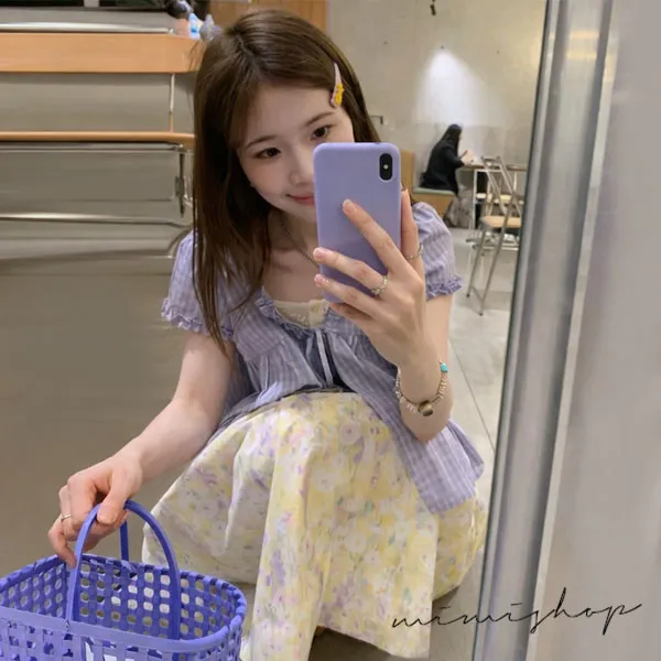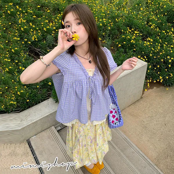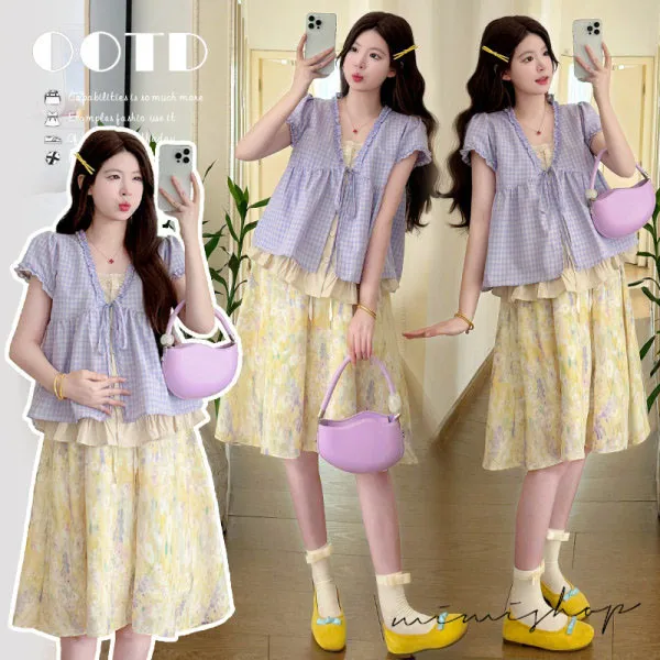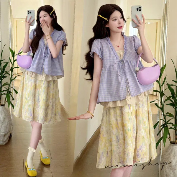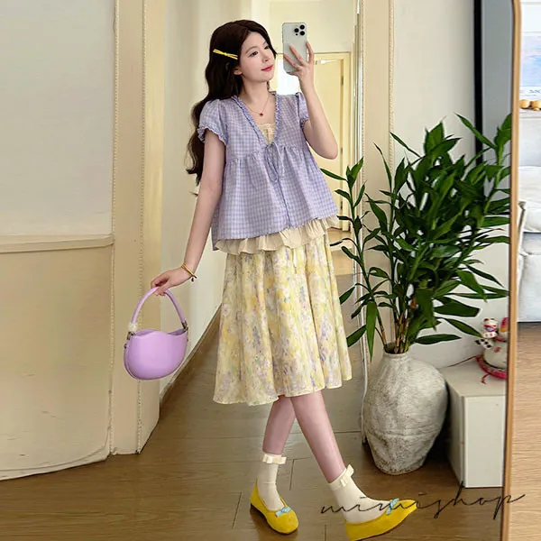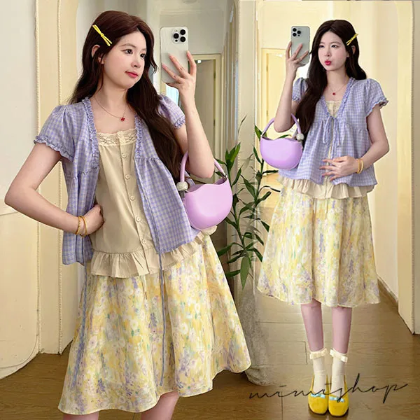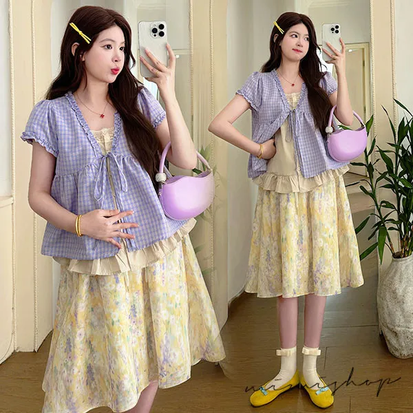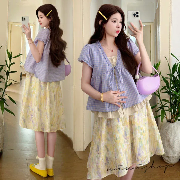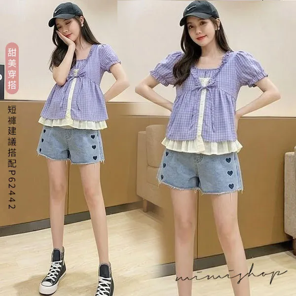 【P511358】春夏序曲 假兩件格子襯衫 層次穿搭 不限孕期