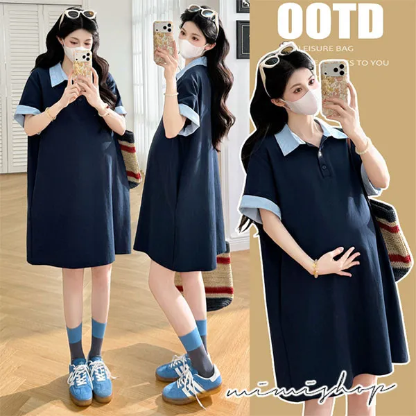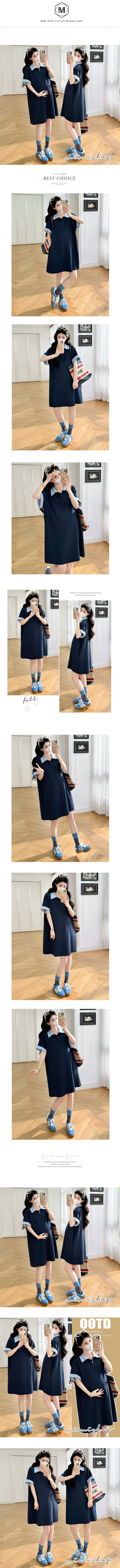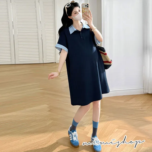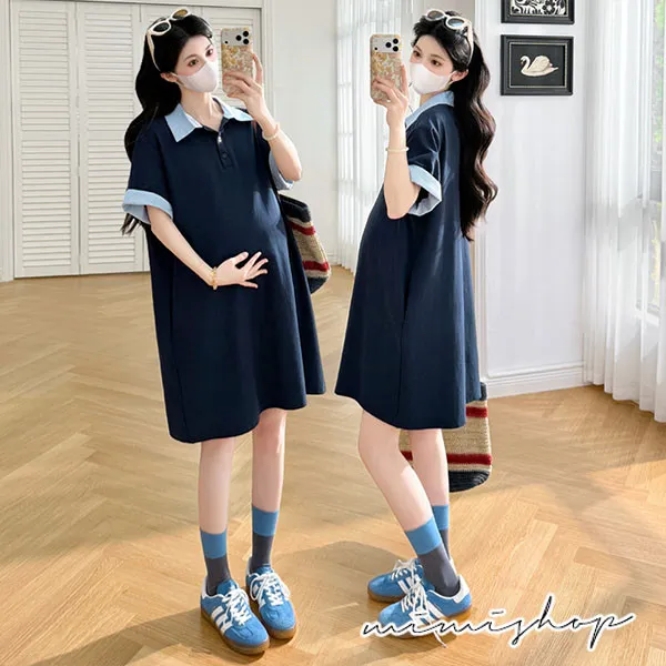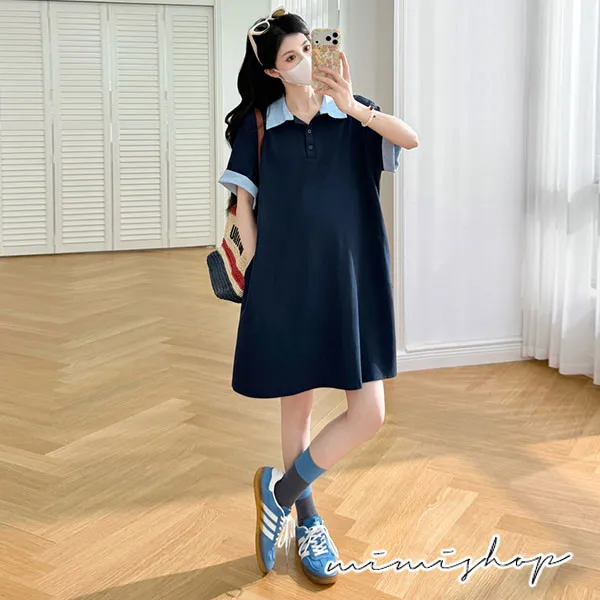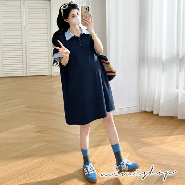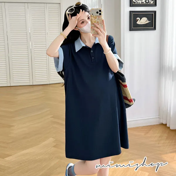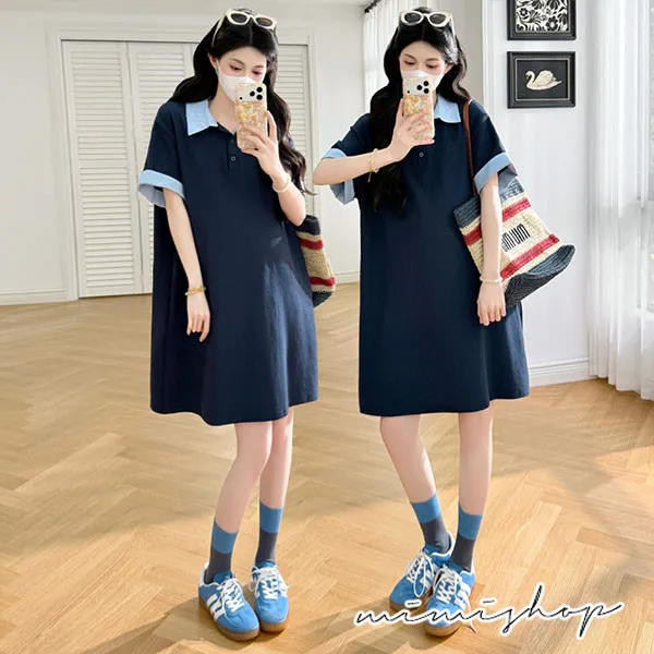 【P511369】休閒寬鬆 翻領撞色polo連衣裙 長上衣 短洋