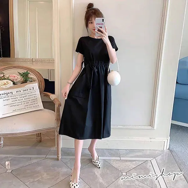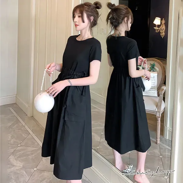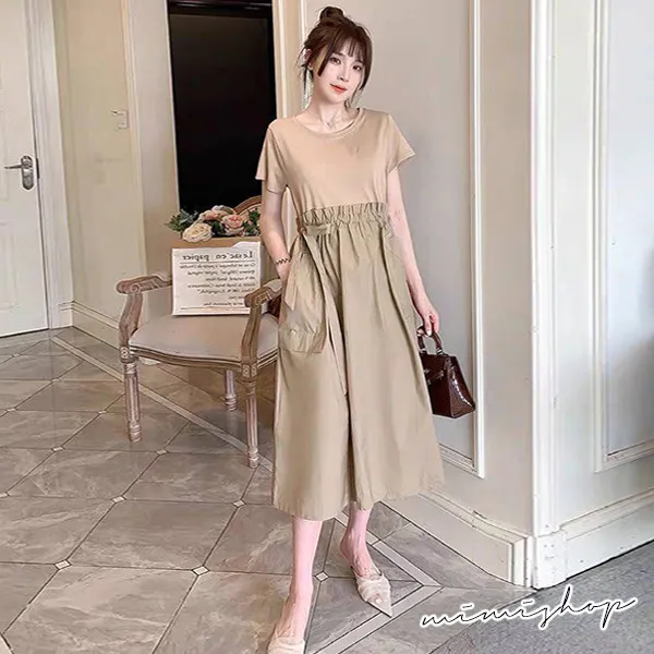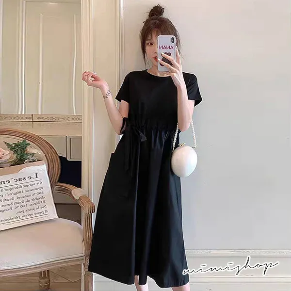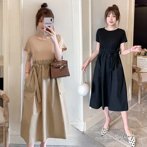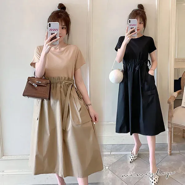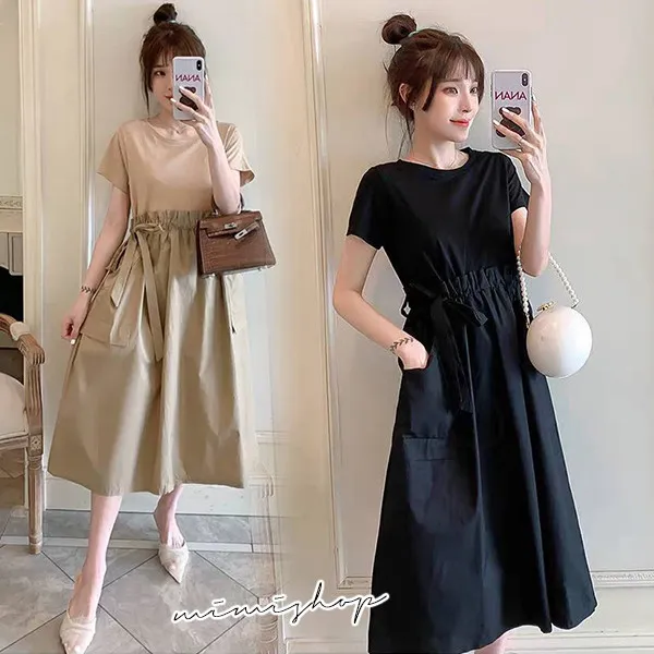 【P521189】顯瘦有型 假兩件拼接抽繩連身裙 孕婦洋裝 長裙