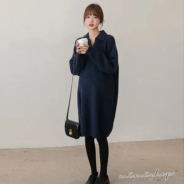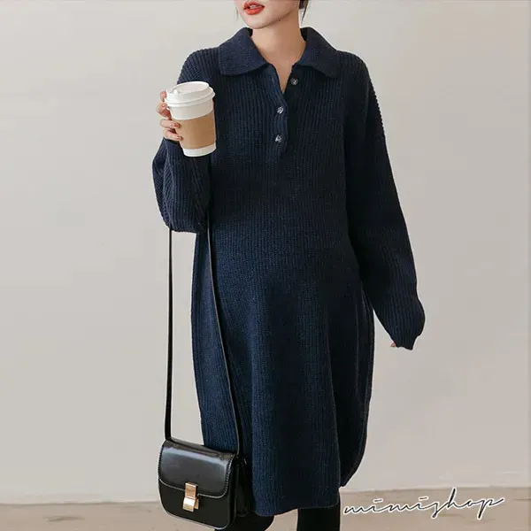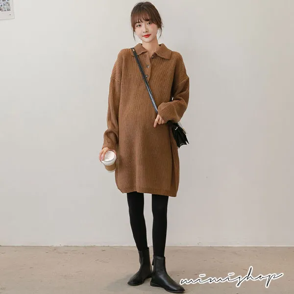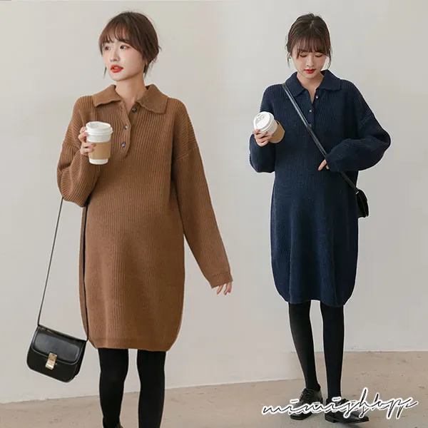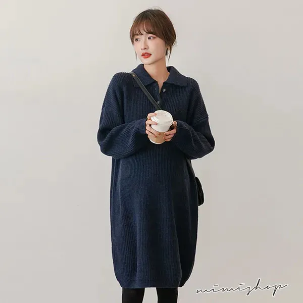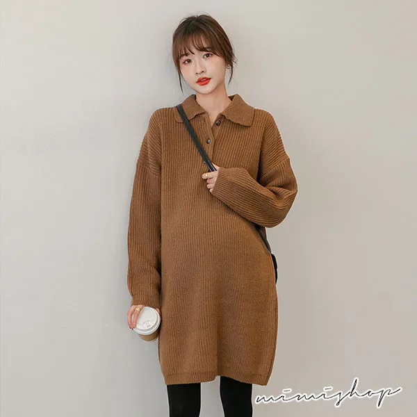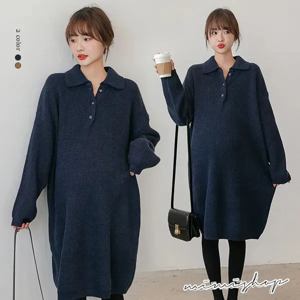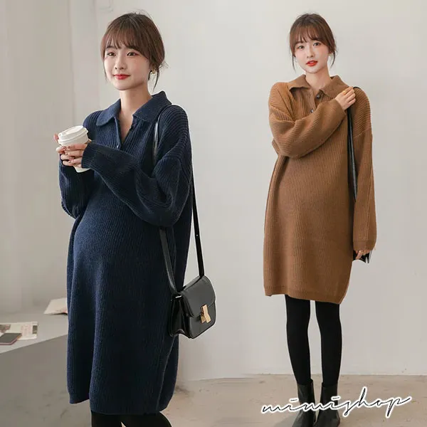 【P521591】暖感扎實 專櫃翻領針織毛衣裙 孕婦裙 長版上衣