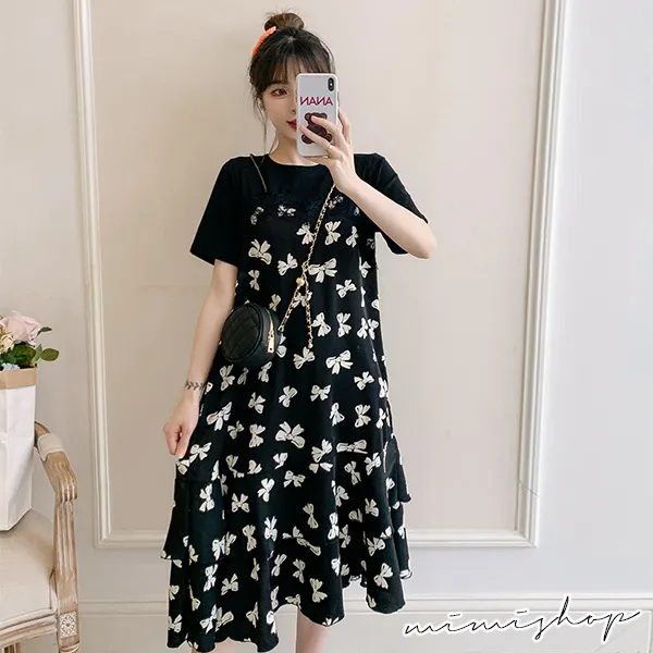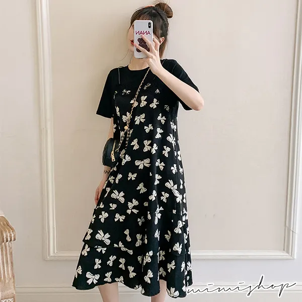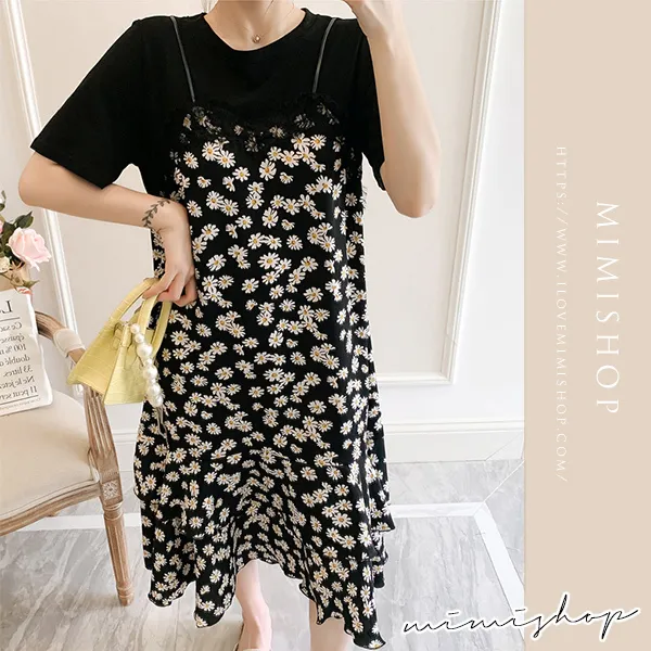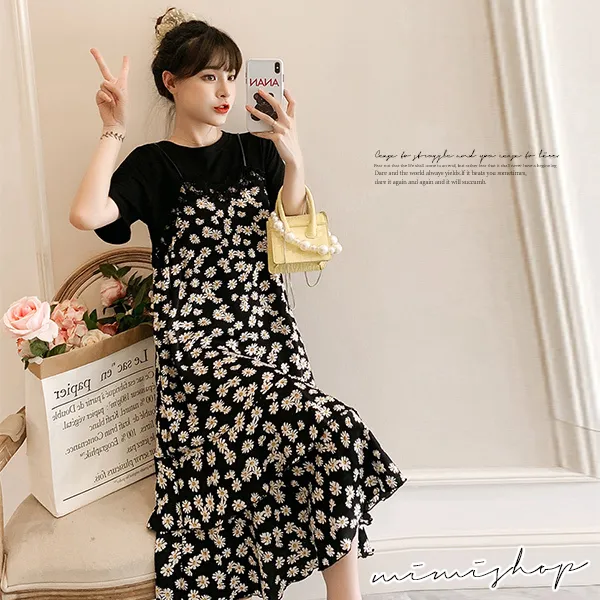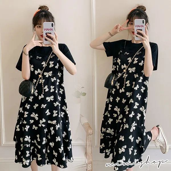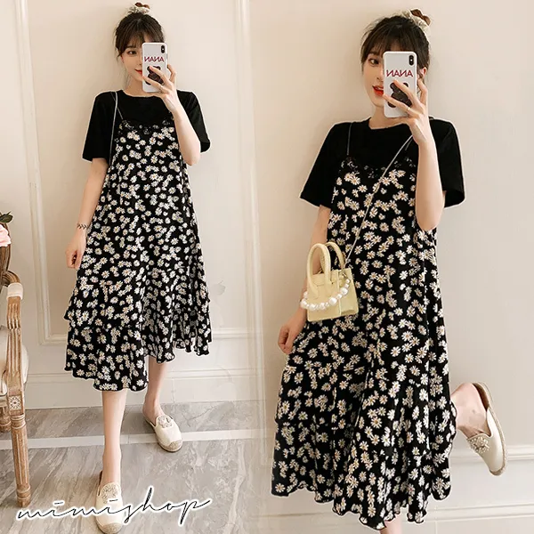 【P521625】輕甜花語 假兩件雪紡拼接連身裙 孕婦洋裝 長裙