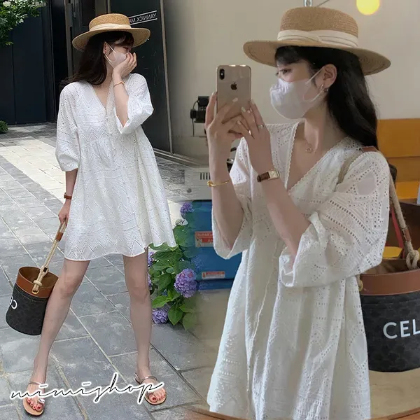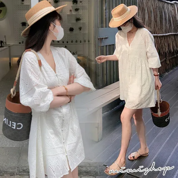 【P521643】純粹雅緻 美感鏤空蕾絲V領連身裙 孕婦洋裝