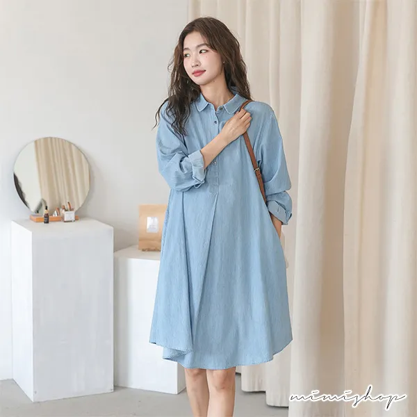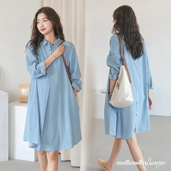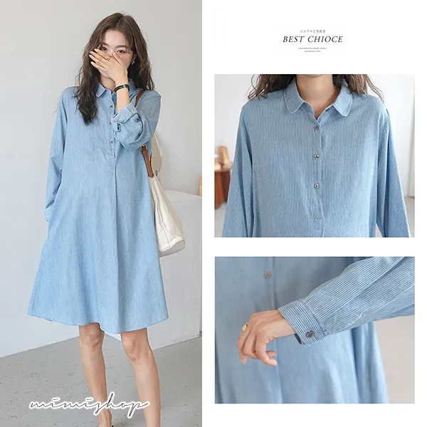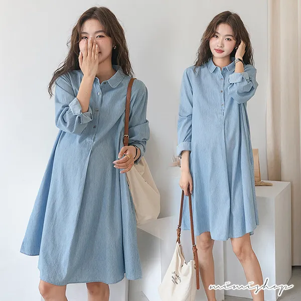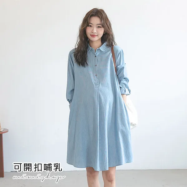 【P521789】小清新 長袖翻領襯衫連身裙 開扣哺乳裙 寬襬修飾