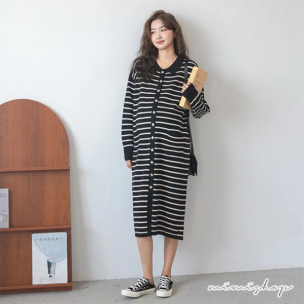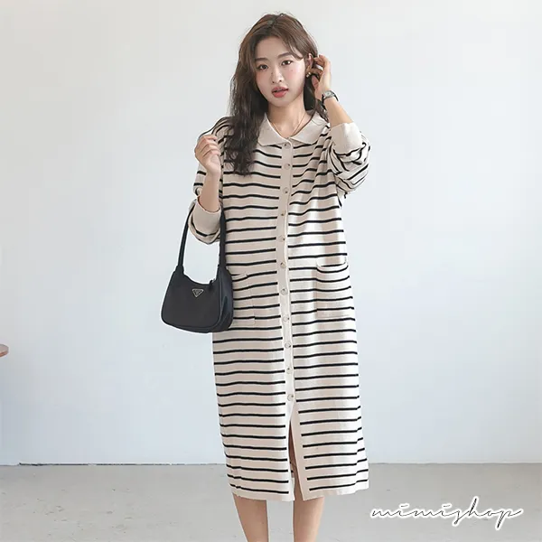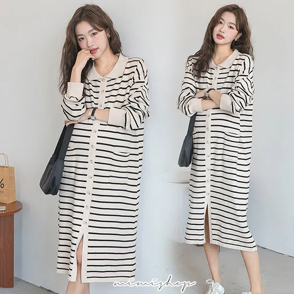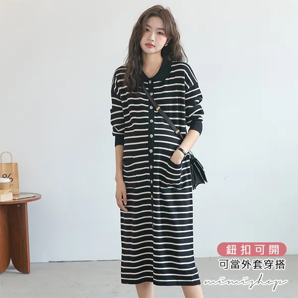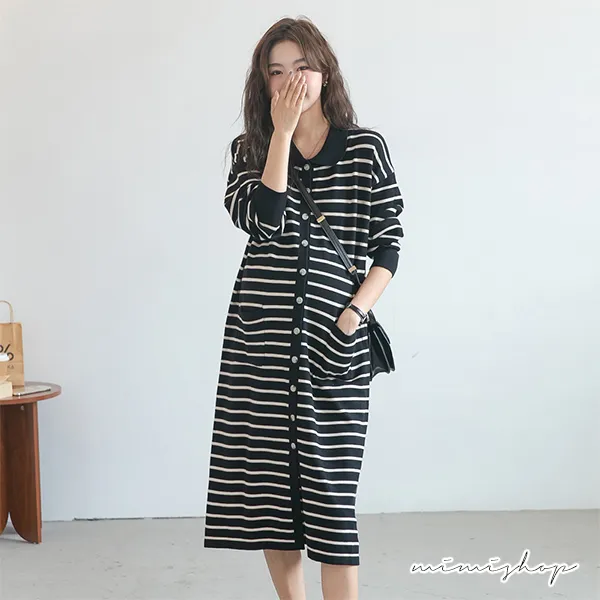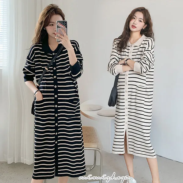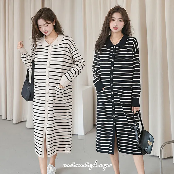 【P521805】簡單好氣質 POLO領條紋針織裙 孕婦洋裝 開扣哺乳