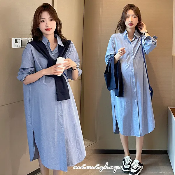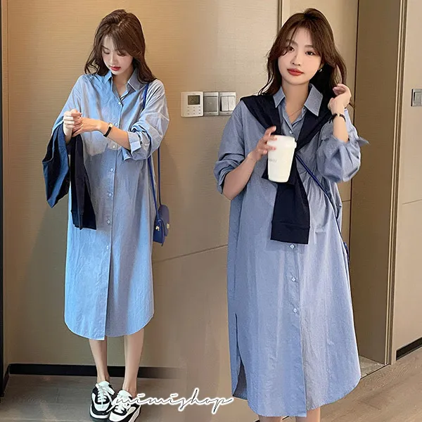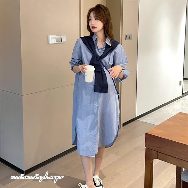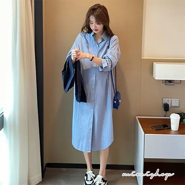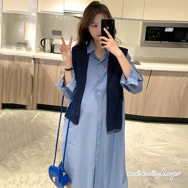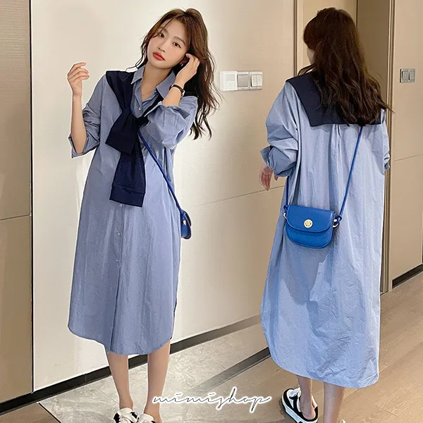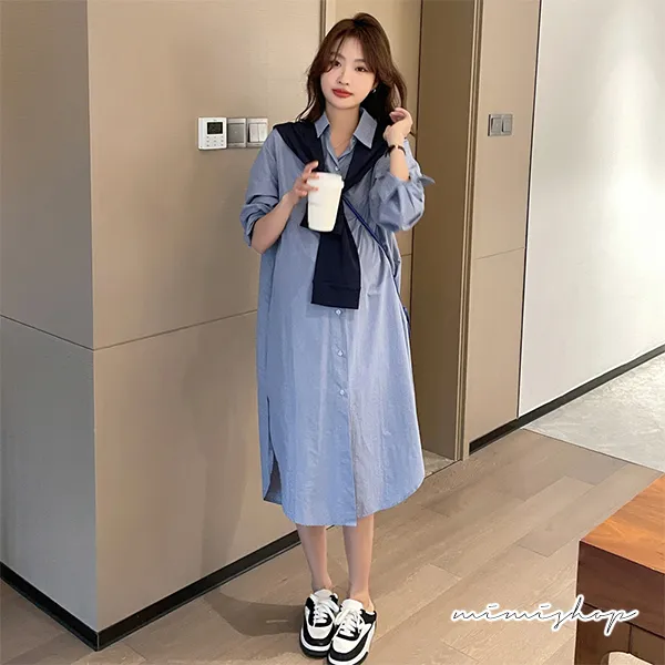 【P521858】送披肩 氣質寬版襯衫裙 孕婦裙 開扣哺乳衣