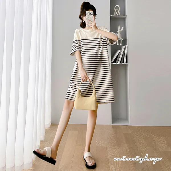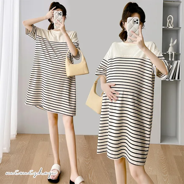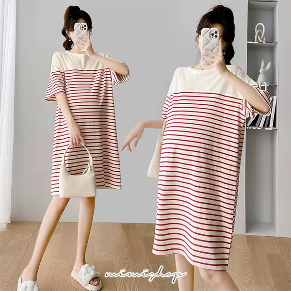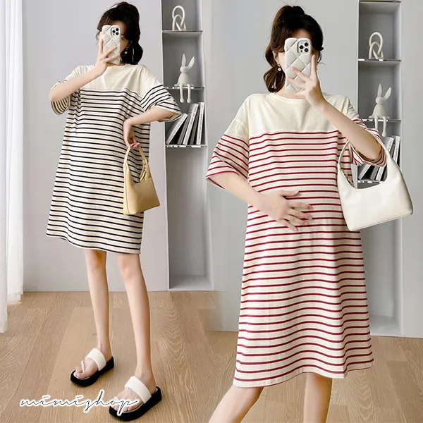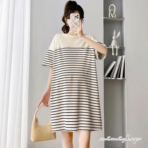 【P521878】日系簡約 海軍風條紋棉質連身裙 孕婦洋裝