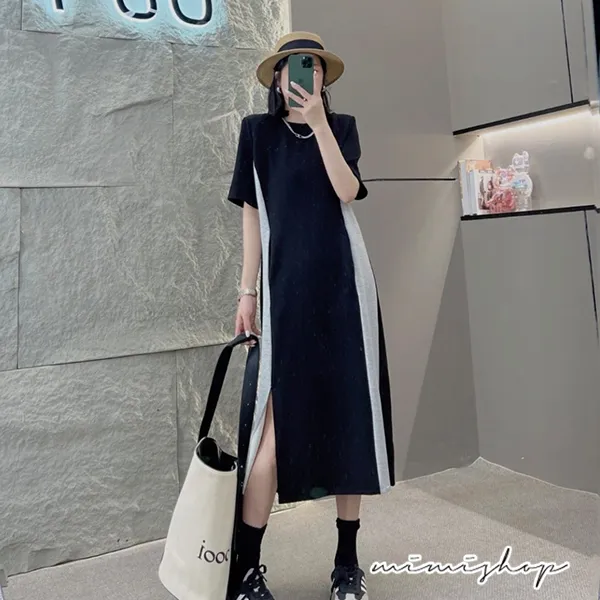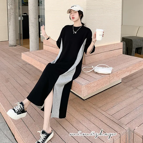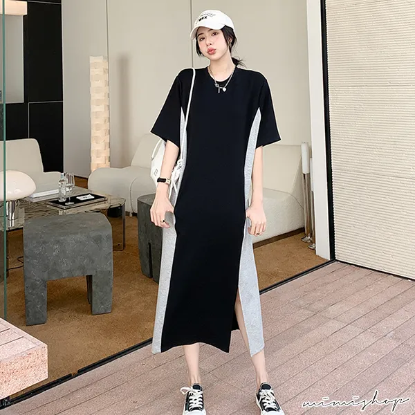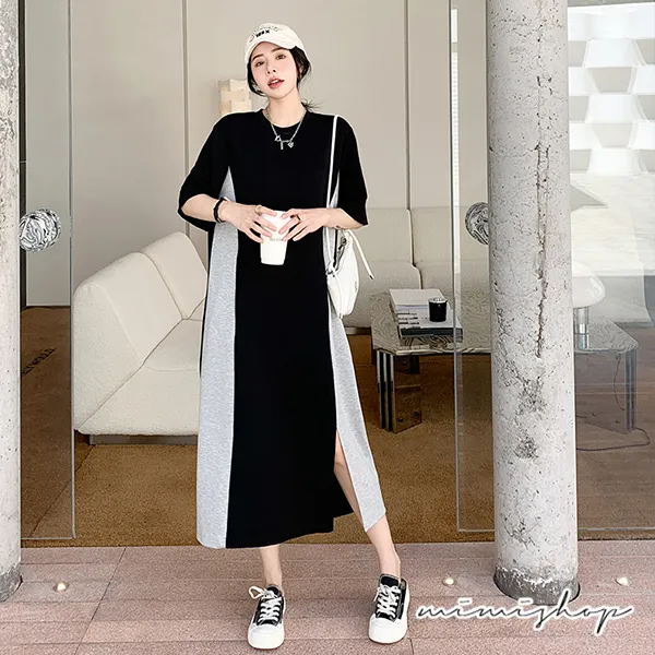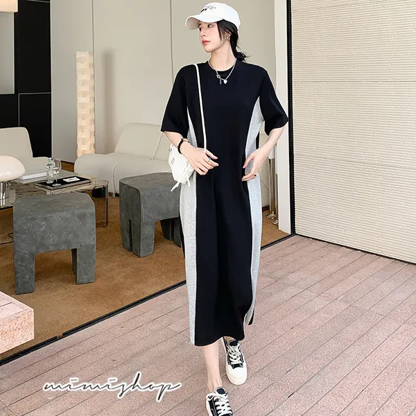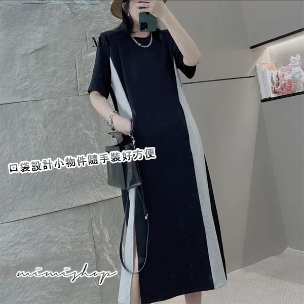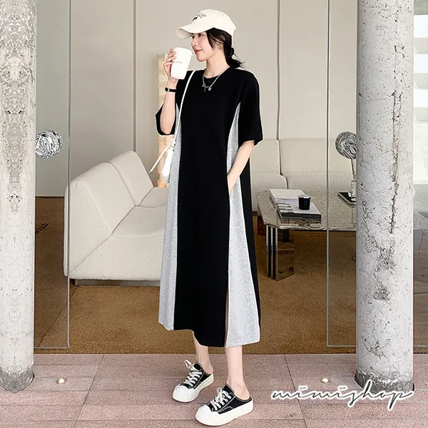 【P522010】拼接設計感 寬版撞色口袋連身裙 孕婦洋裝 長裙