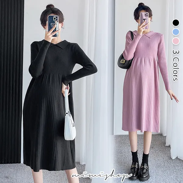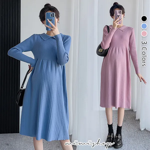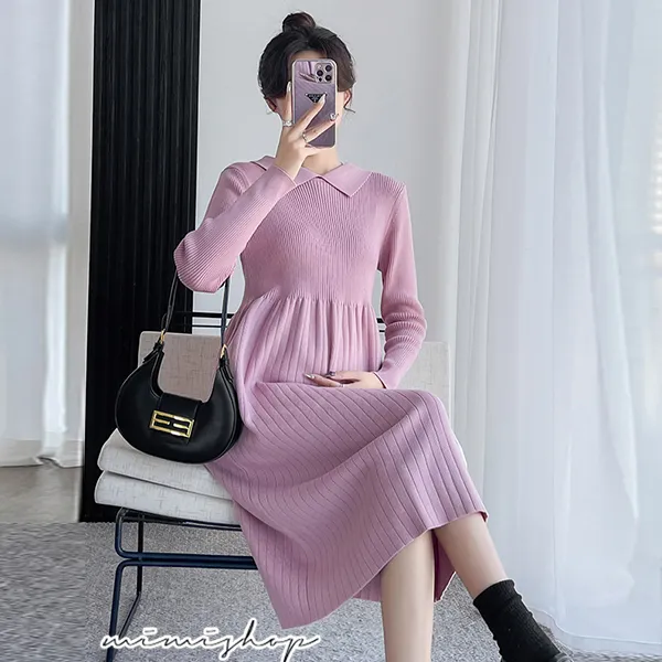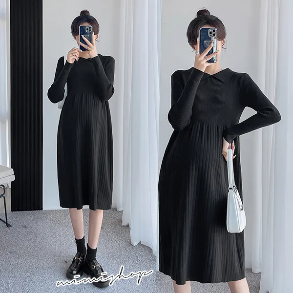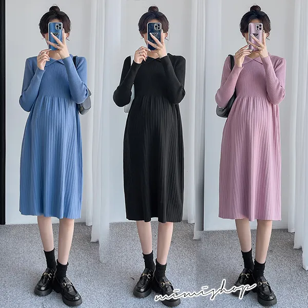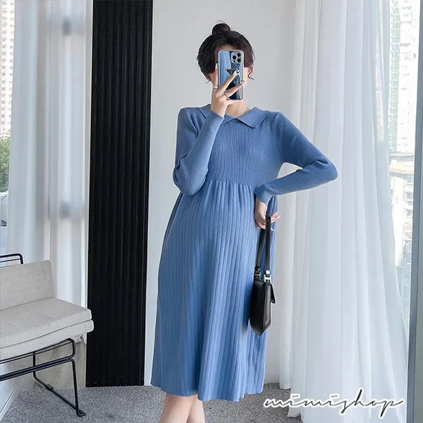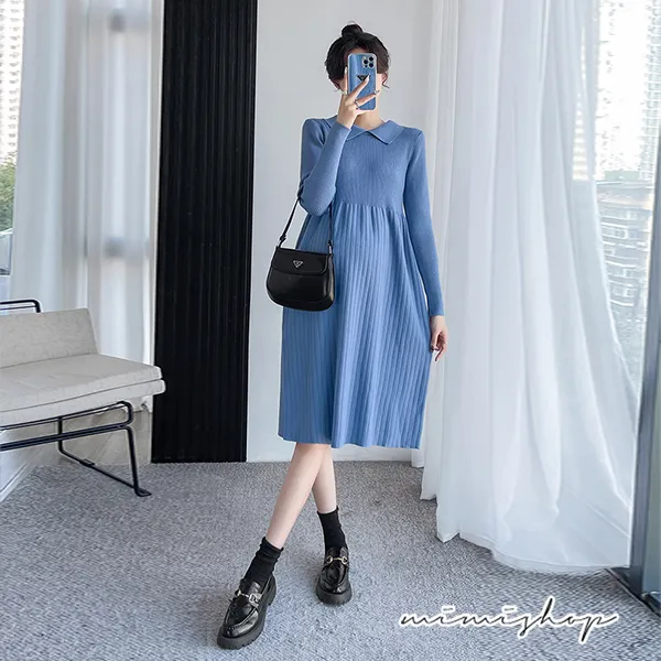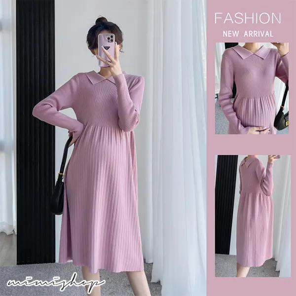 【P522029】簡約氣質 小翻領針織裙 毛衣裙 孕婦洋裝