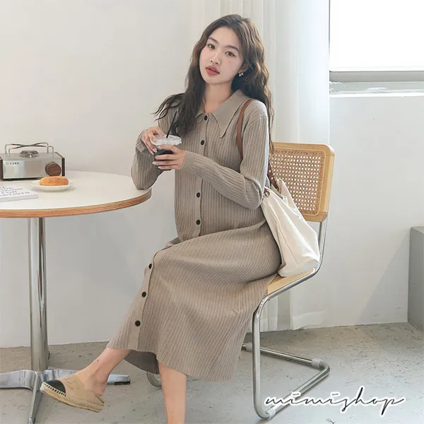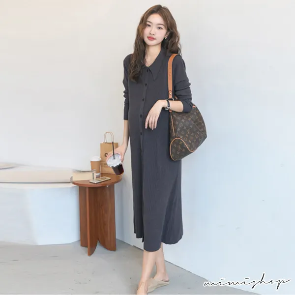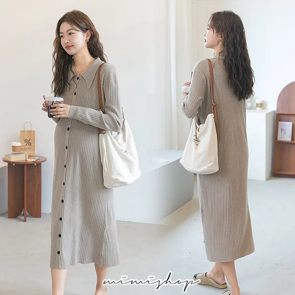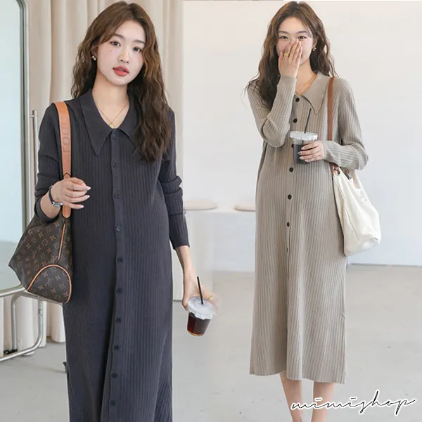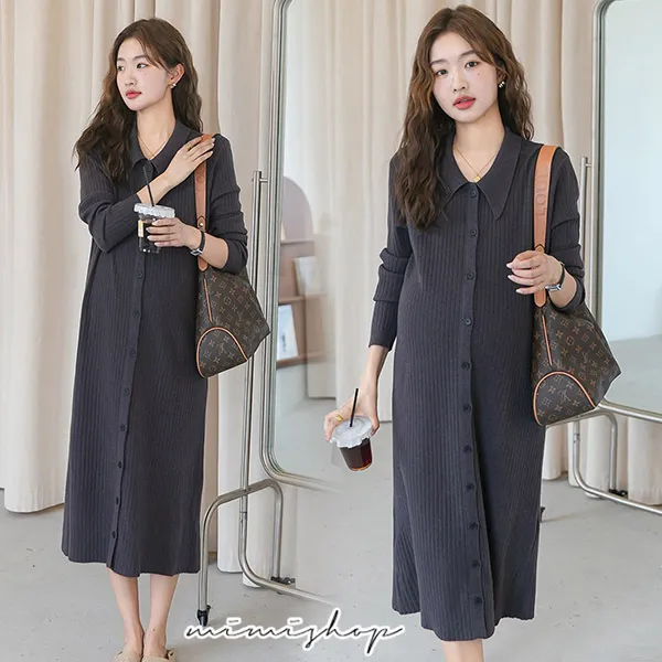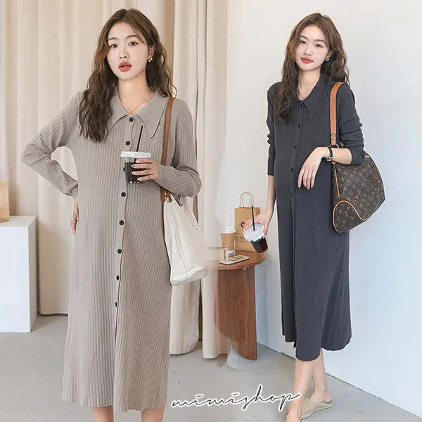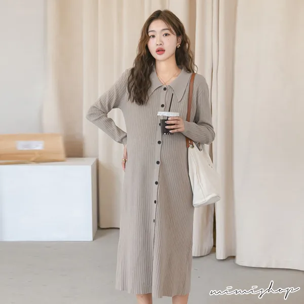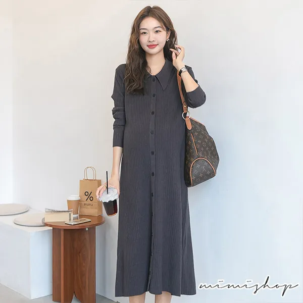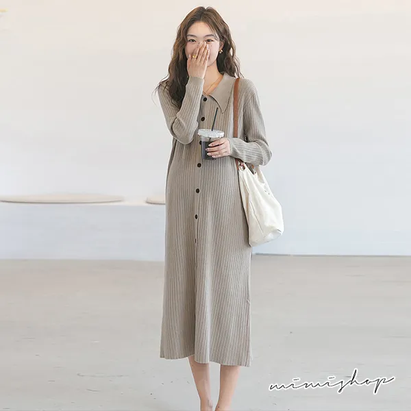 【P522036】獨特氣質 復古翻領坑條針織連衣裙 孕婦洋裝 長裙