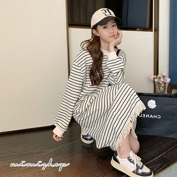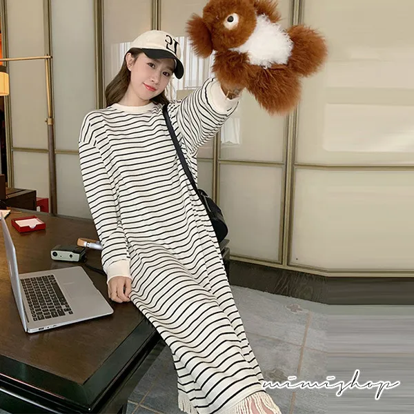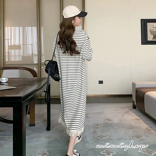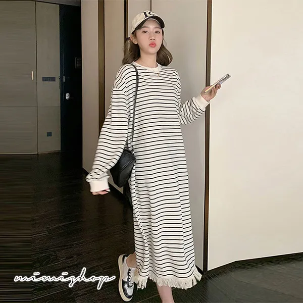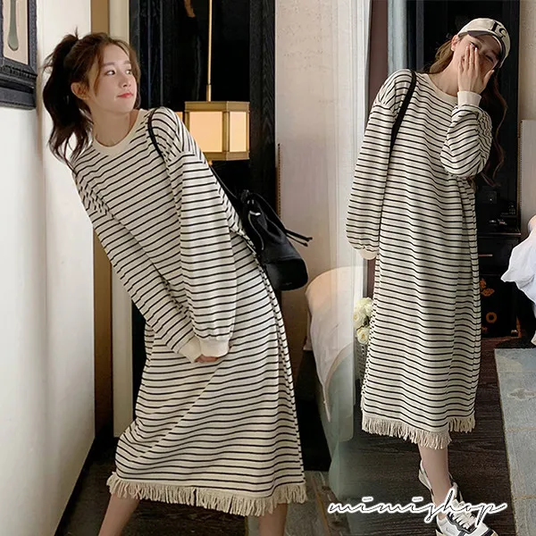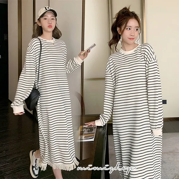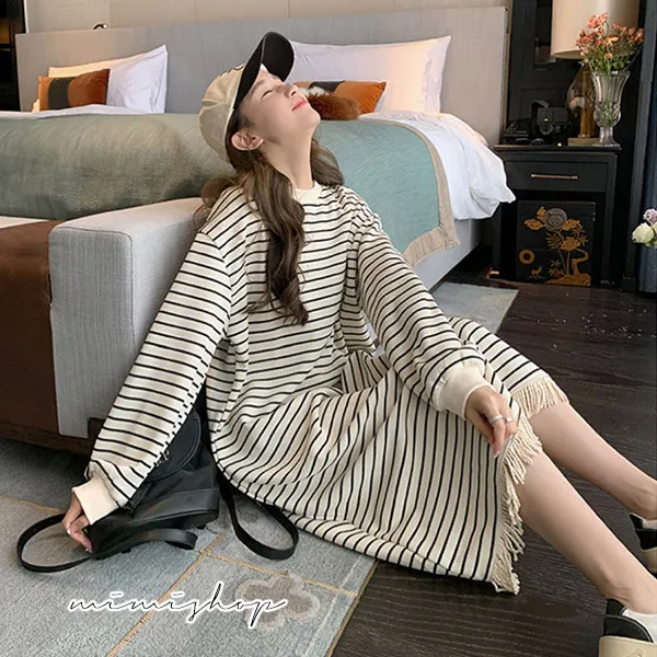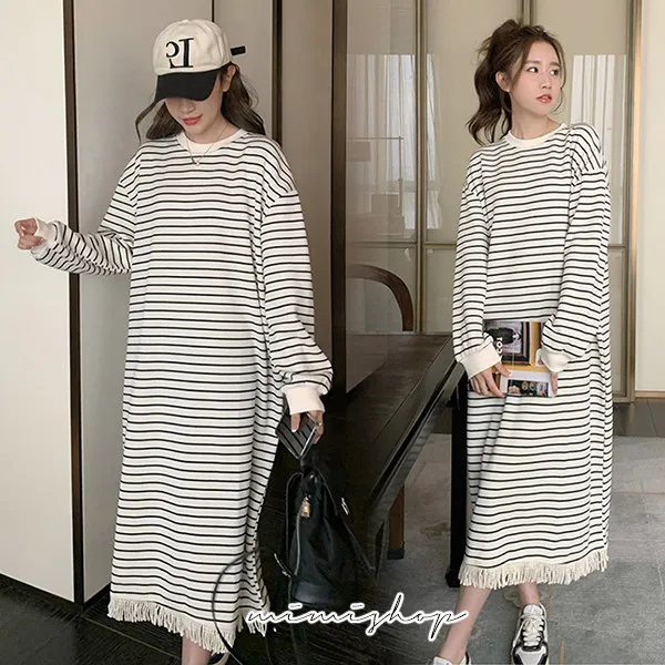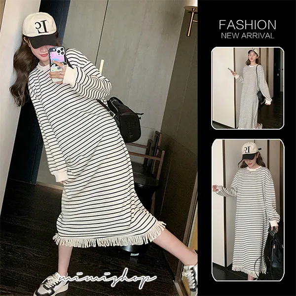 【P522040】寬版實穿 長袖條紋流蘇連身裙 孕婦洋裝 長裙