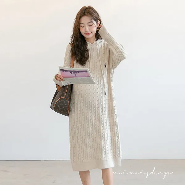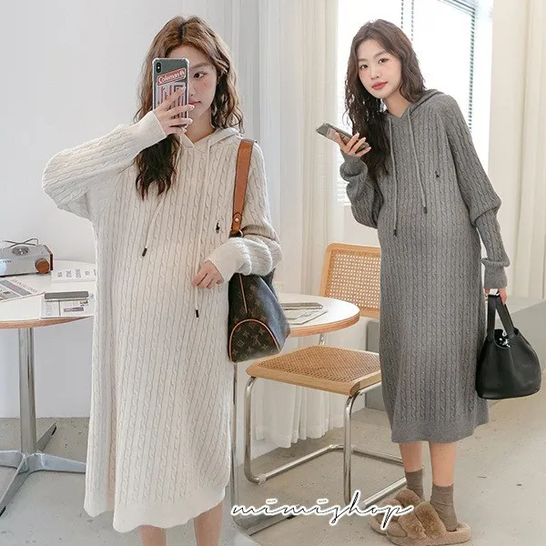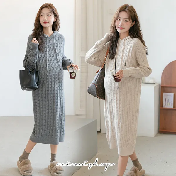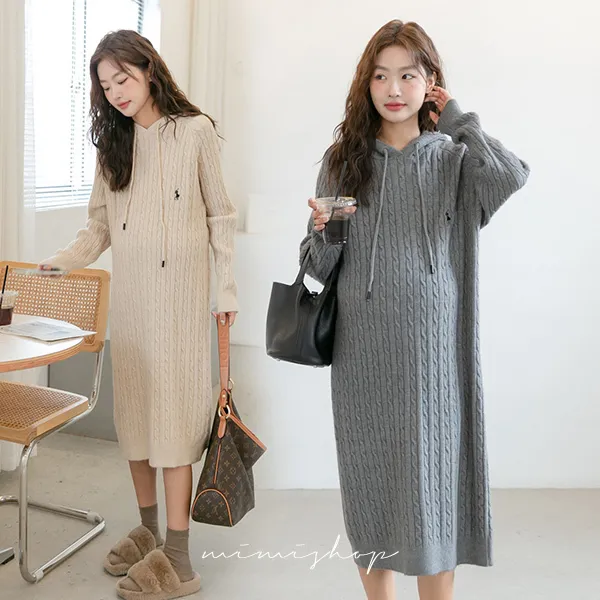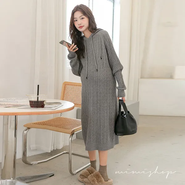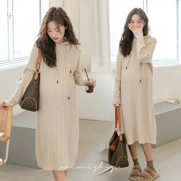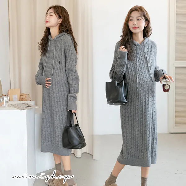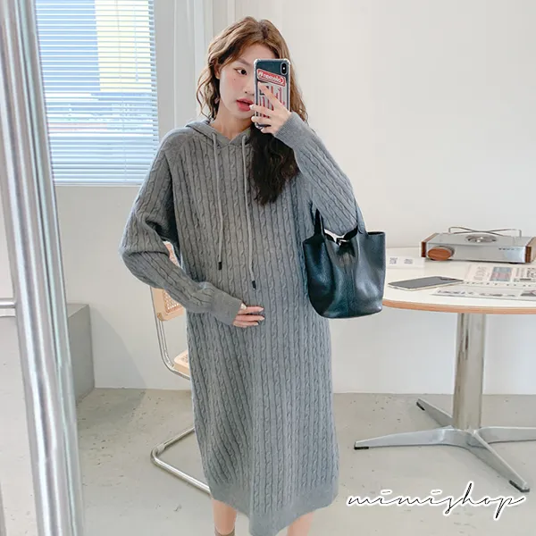 【P522064】溫暖氣質 優質連帽麻花針織毛衣裙 孕婦裙 長裙