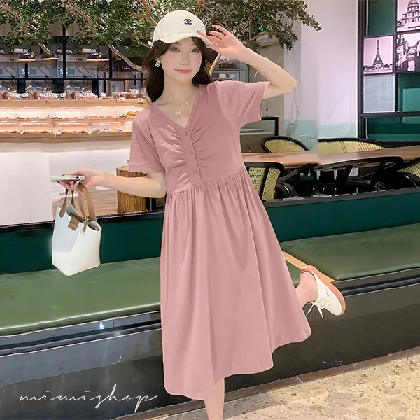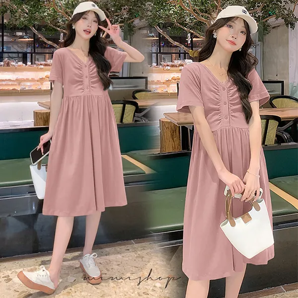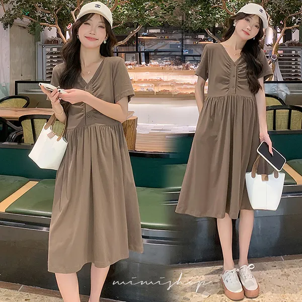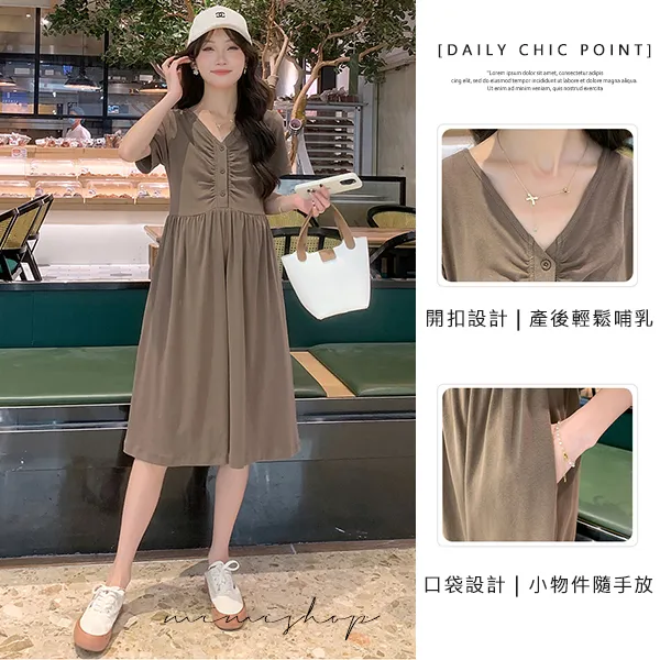 【P522065】日安美好 V領抓褶連身裙 孕婦洋裝 開扣哺乳裙