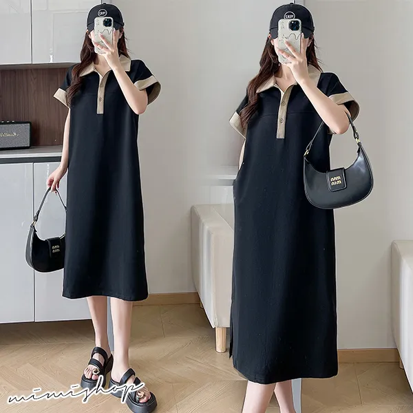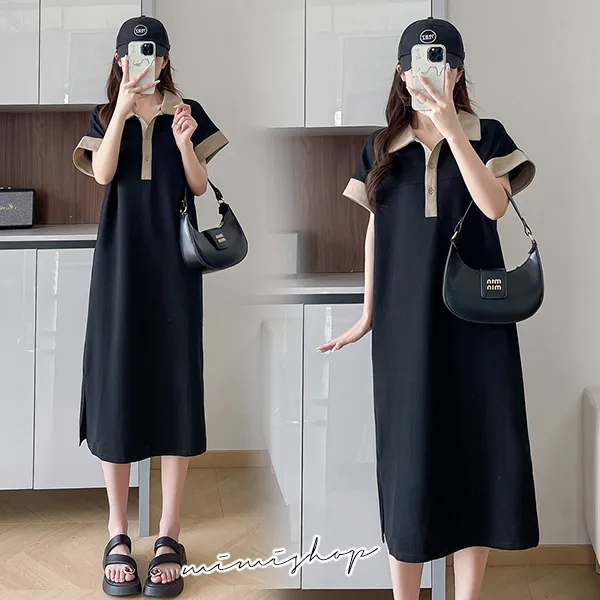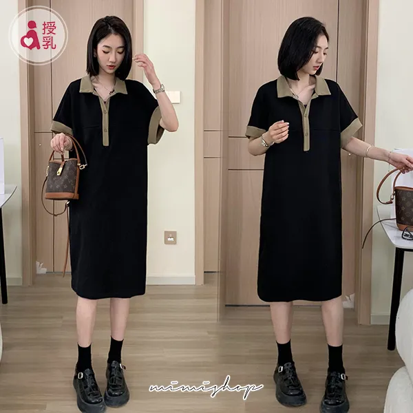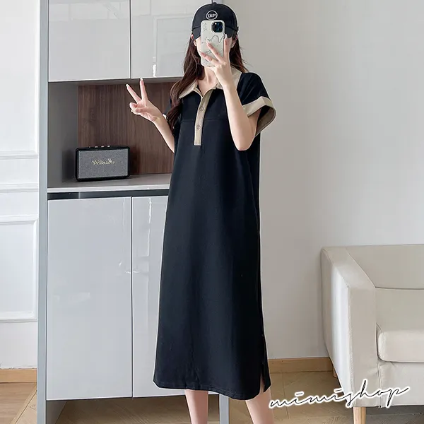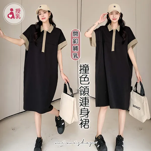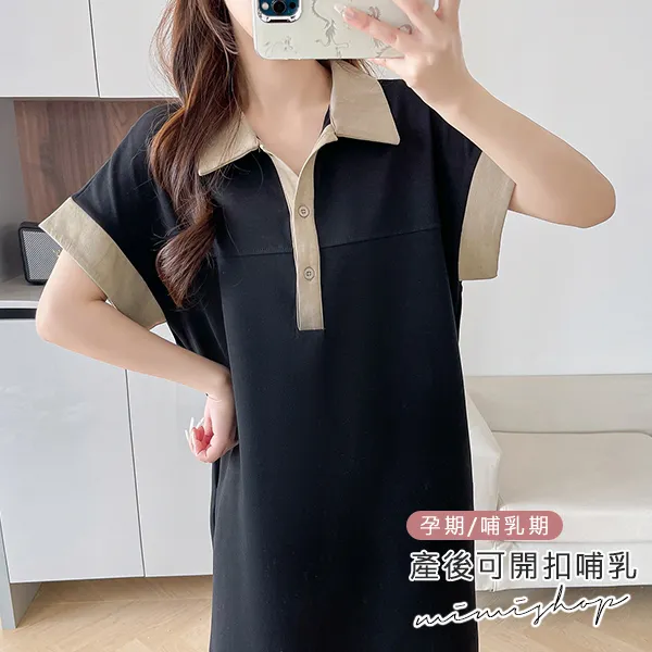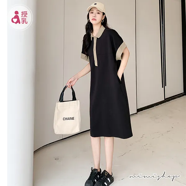 【P522091】簡潔氣質 撞色POLO領連身裙 孕婦洋裝 開扣哺乳