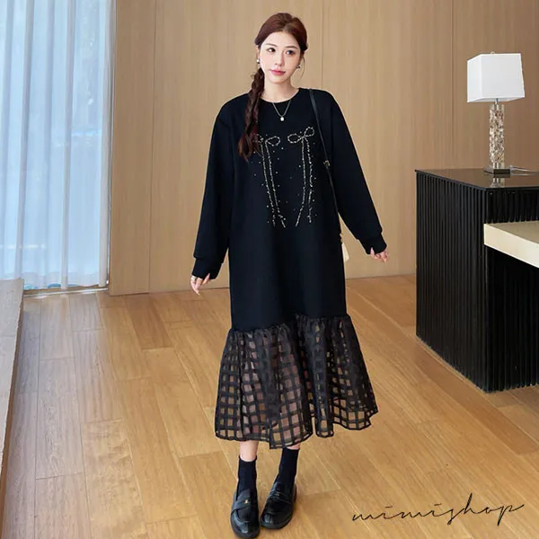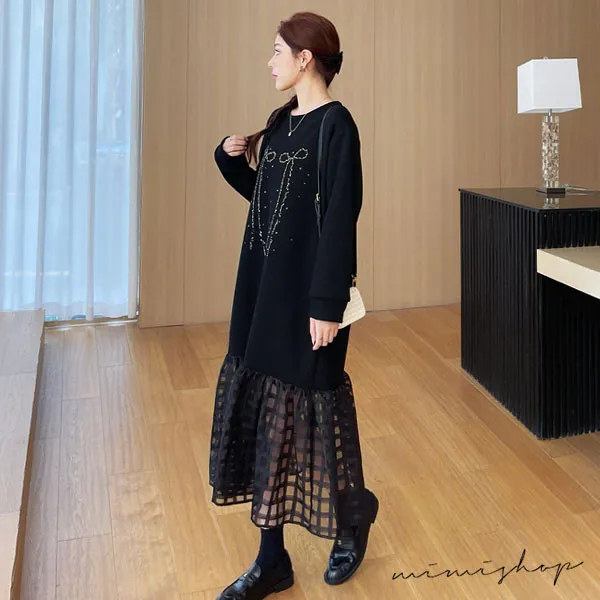 【P522160】復古格子紗長裙 燙鑽蝴蝶結連身裙 孕婦洋裝
