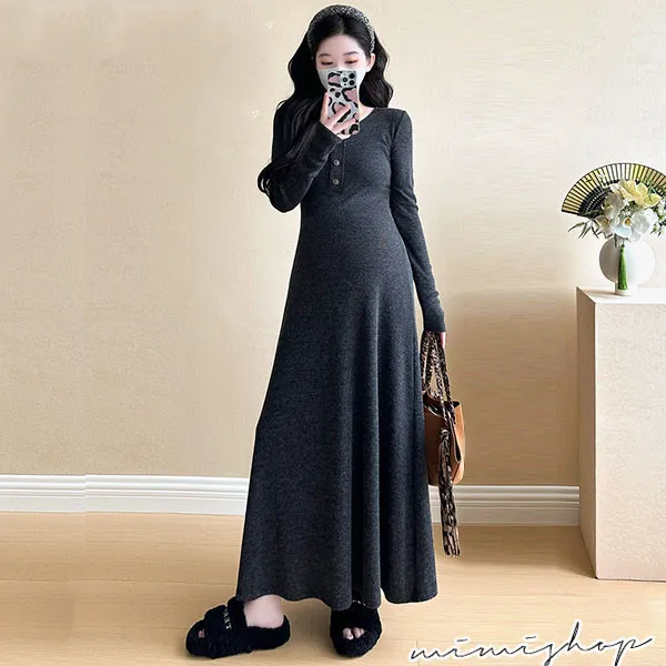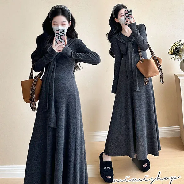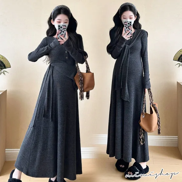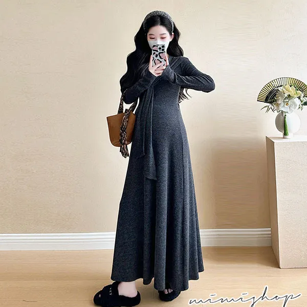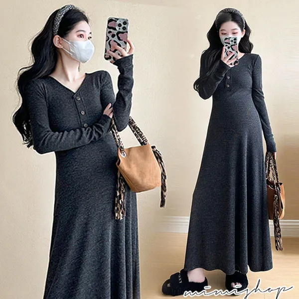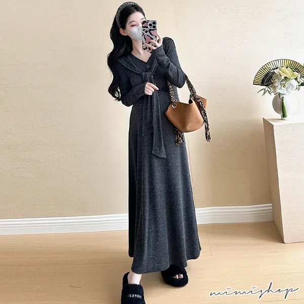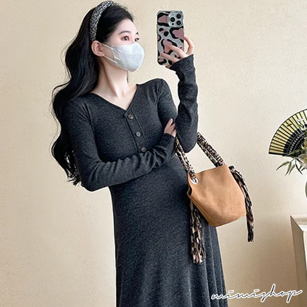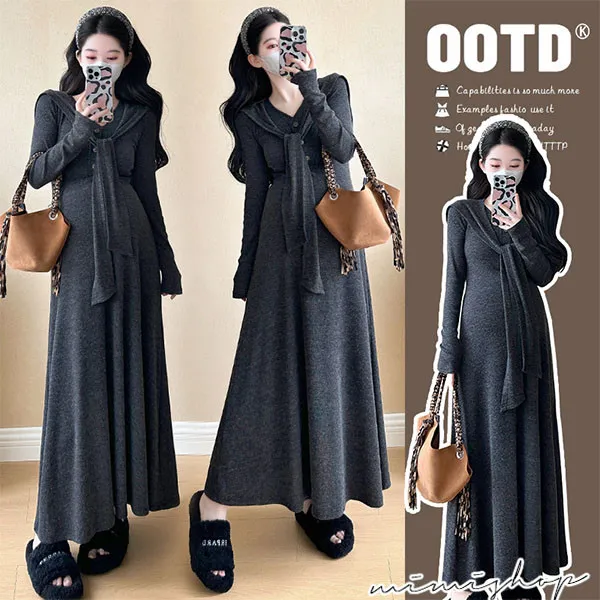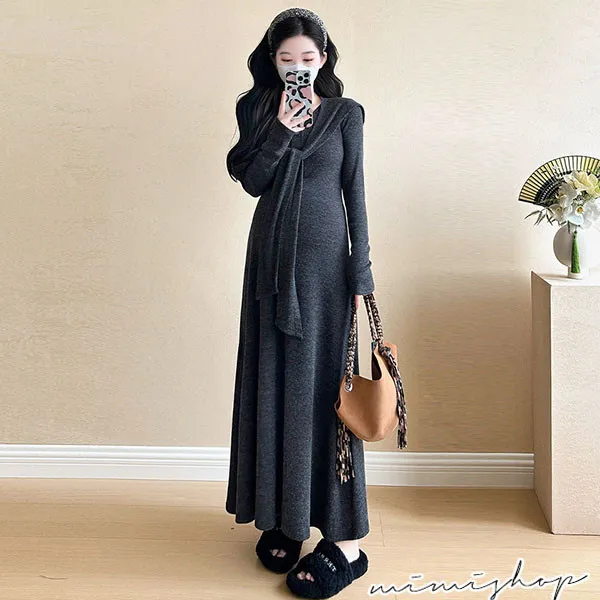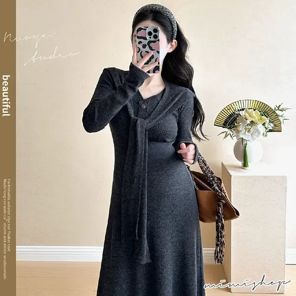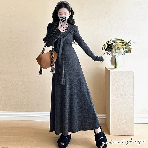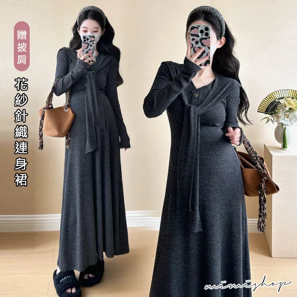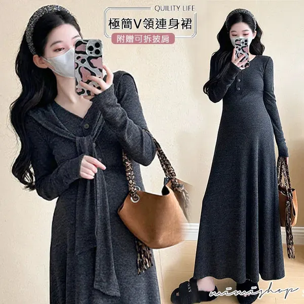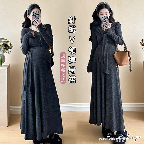【P522169】韓系極簡 附披肩 花紗針織v領連身裙 長裙 孕婦洋裝