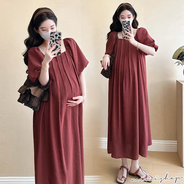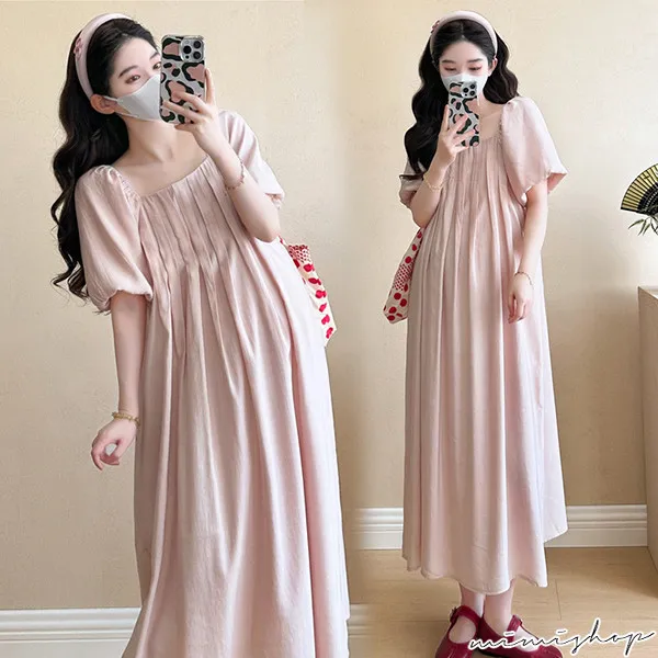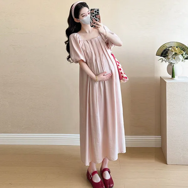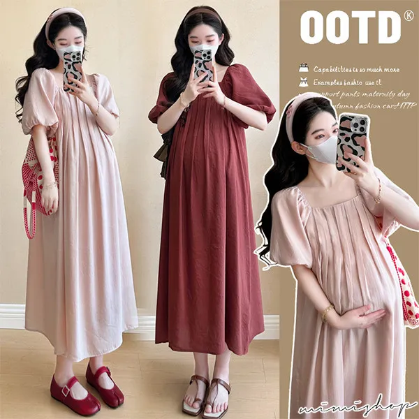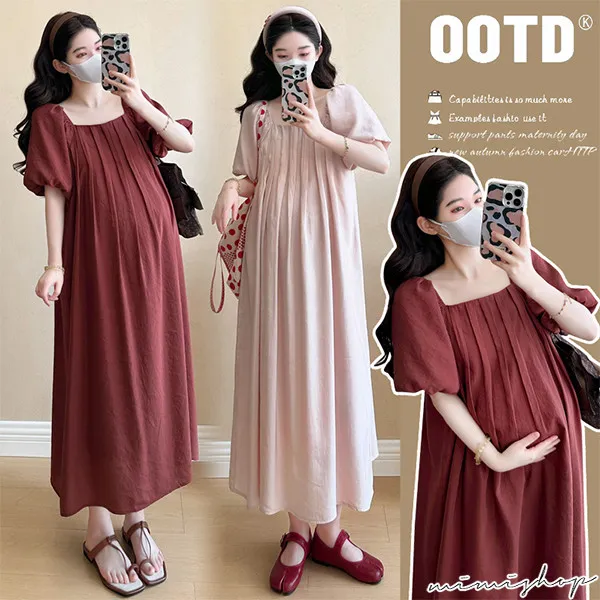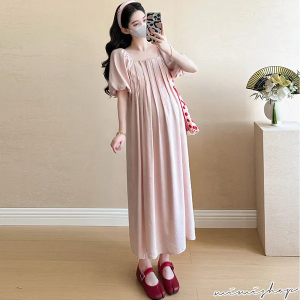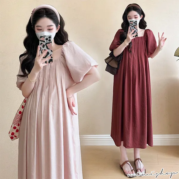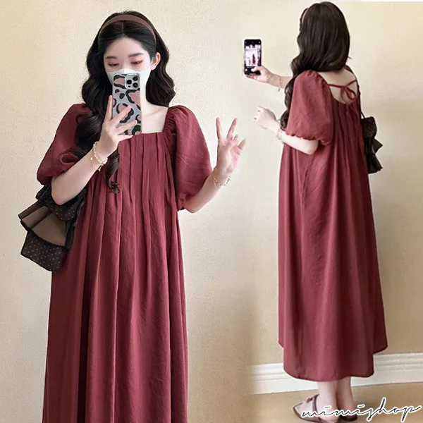 【P522258】 美麗佳人 優雅方領泡泡袖連身裙 孕婦洋裝 長裙