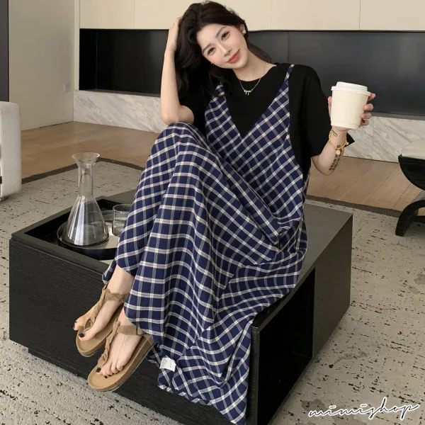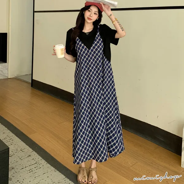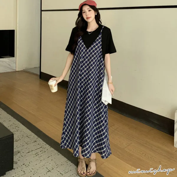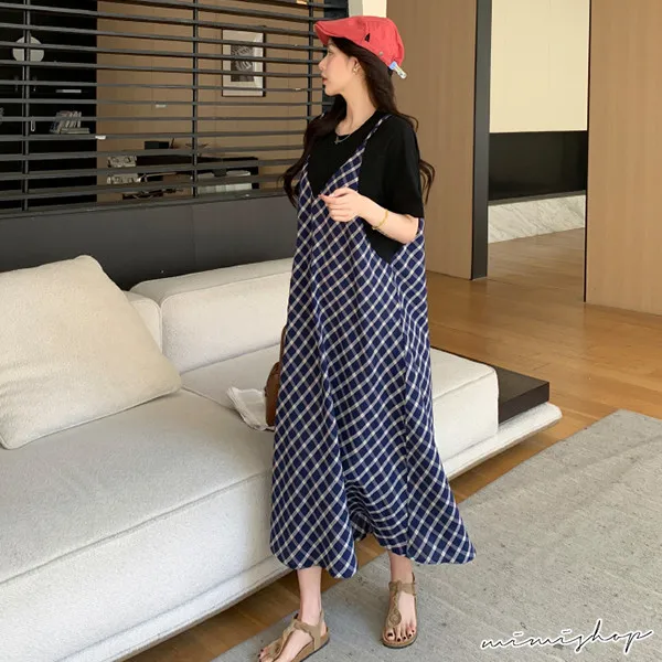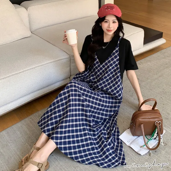 【P522271】英倫格紋 假兩件寬鬆連身裙 孕婦洋裝 長裙
