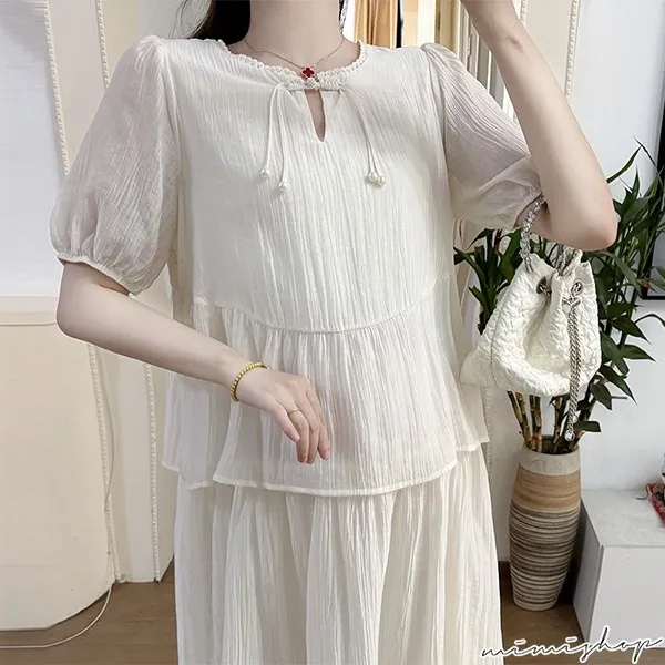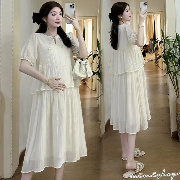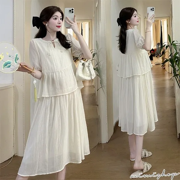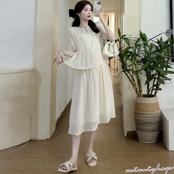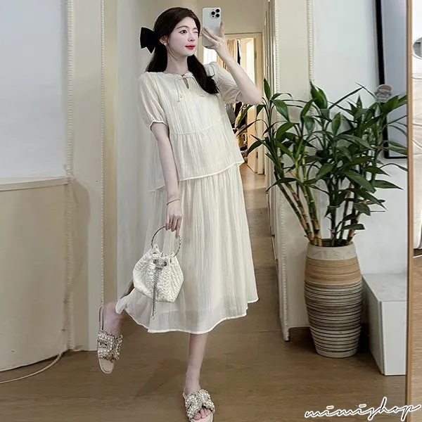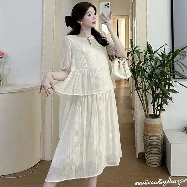 【P522281】 古典優雅 設計感假兩件雪紡連身裙 孕婦洋裝