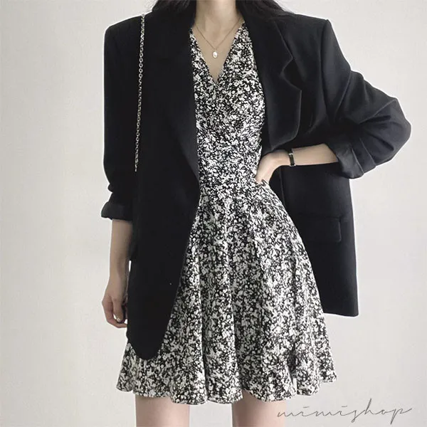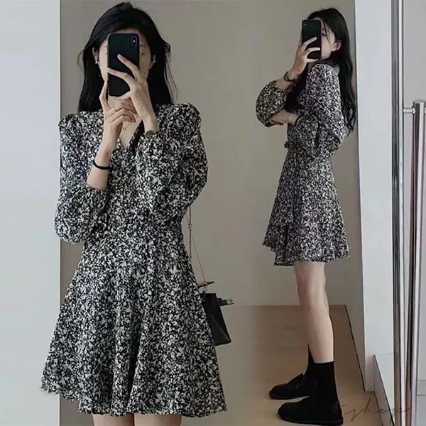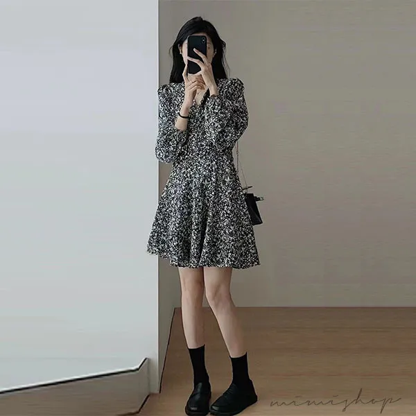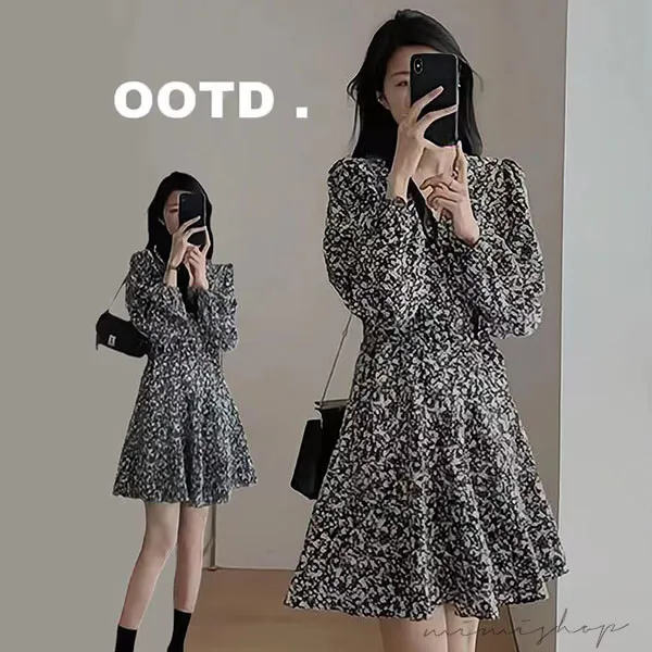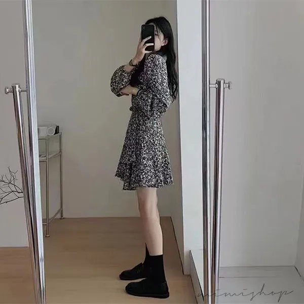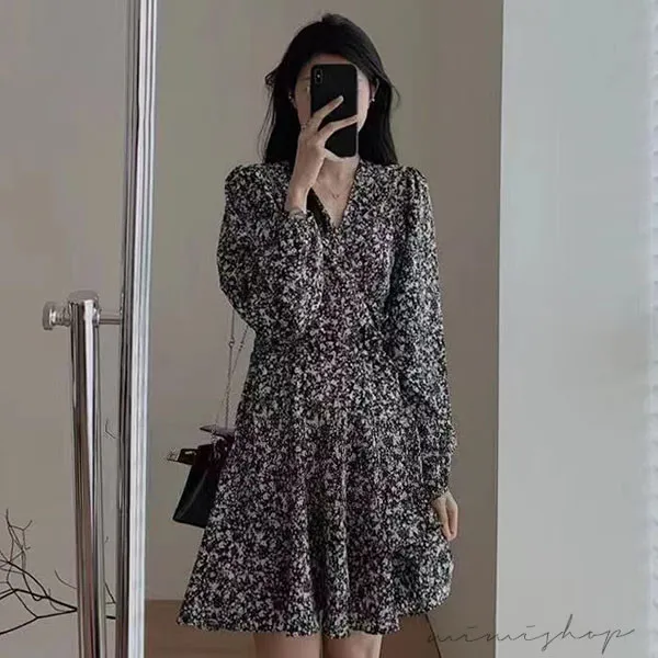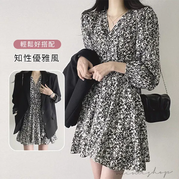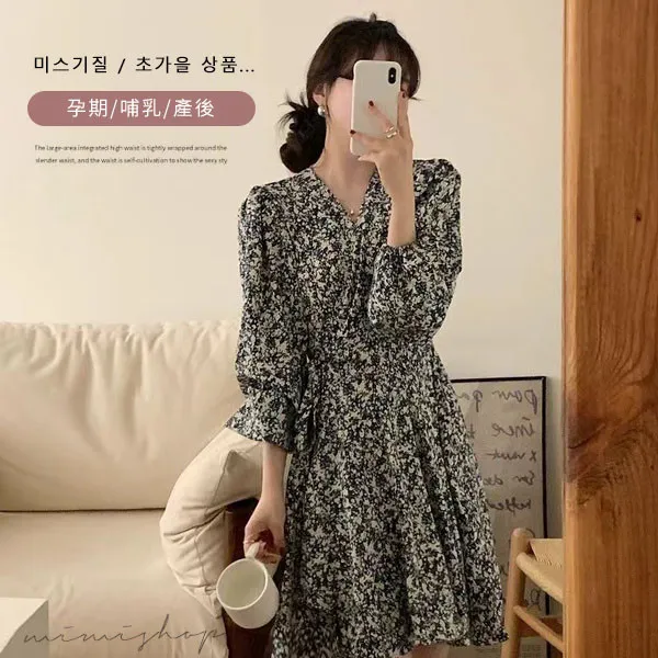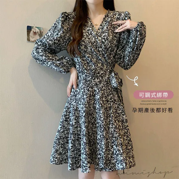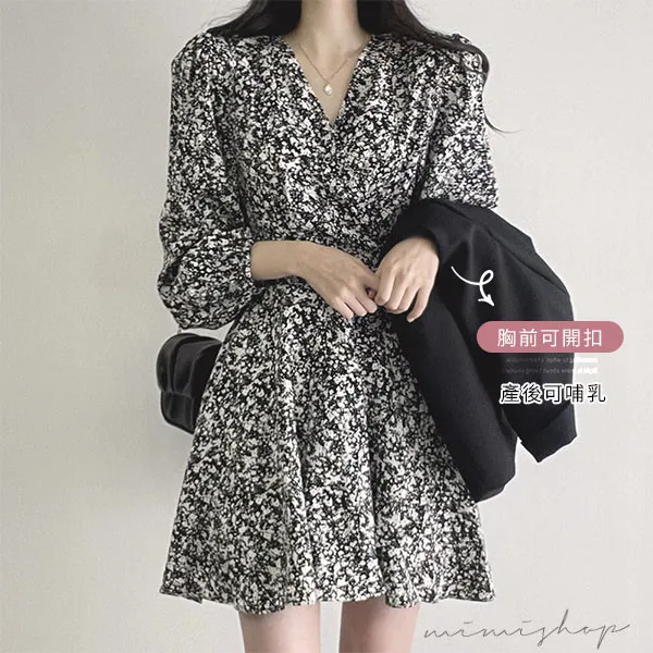 【P522316】莫名顯瘦 長袖雪紡碎花v領交叉哺乳裙 短洋裝 孕哺兩用