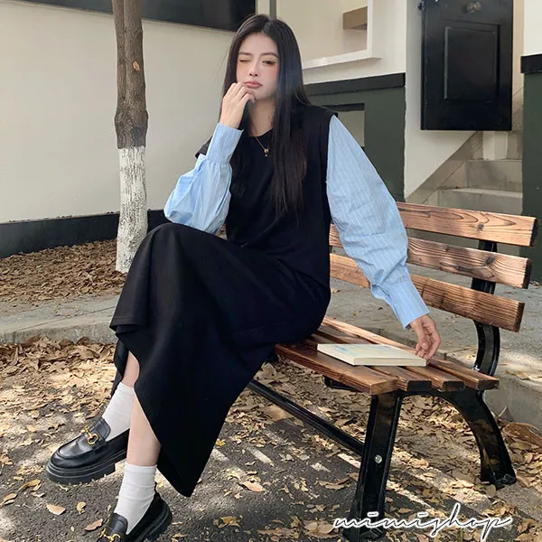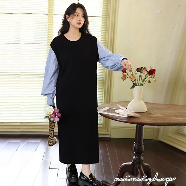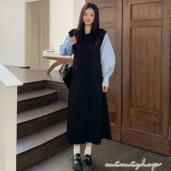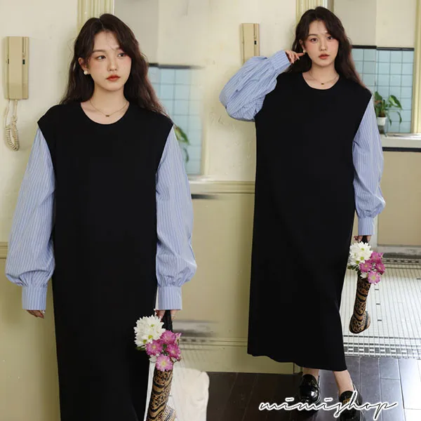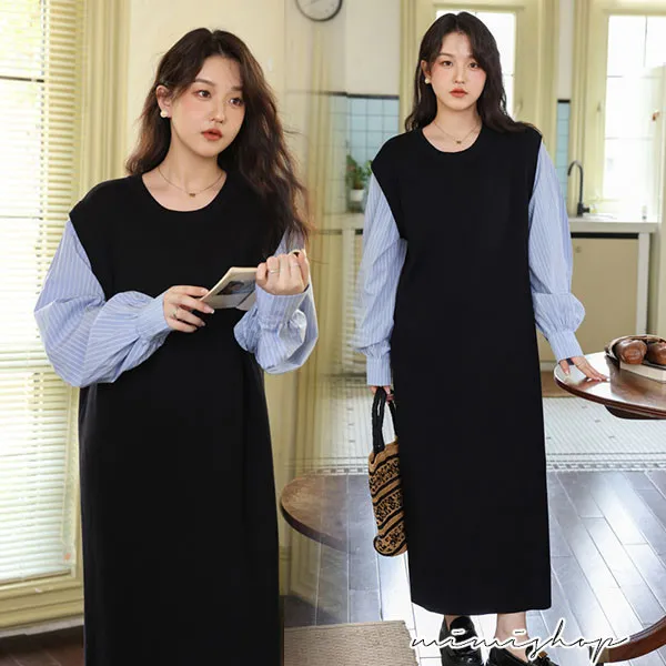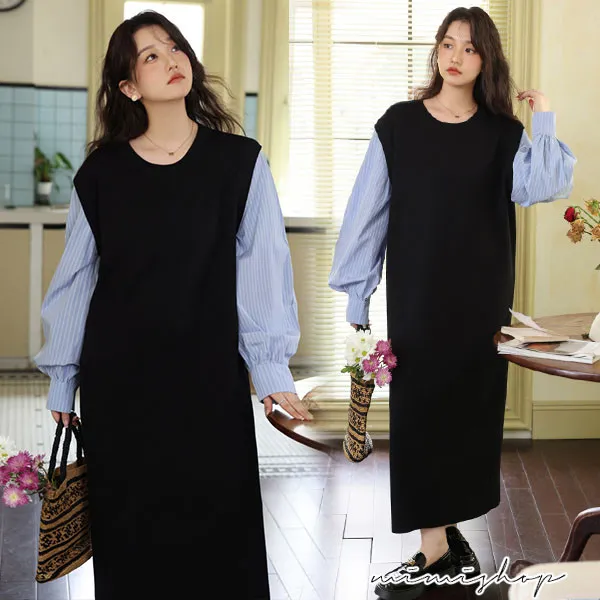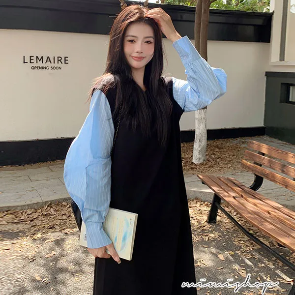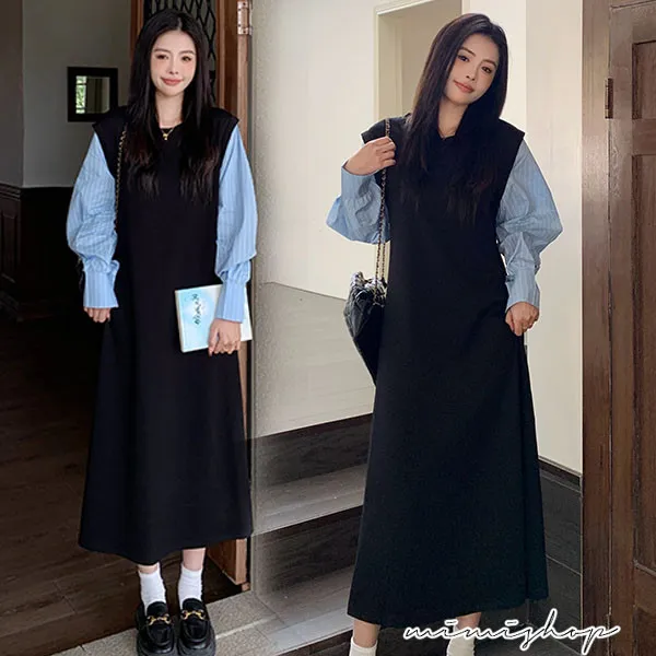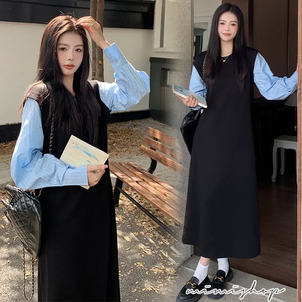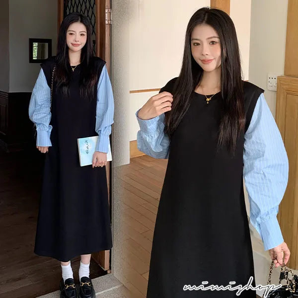 【P522322】單穿就好看 假兩件拼接襯衫裙 孕婦洋裝 長裙 不限孕期
