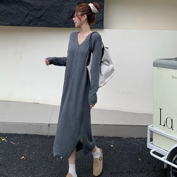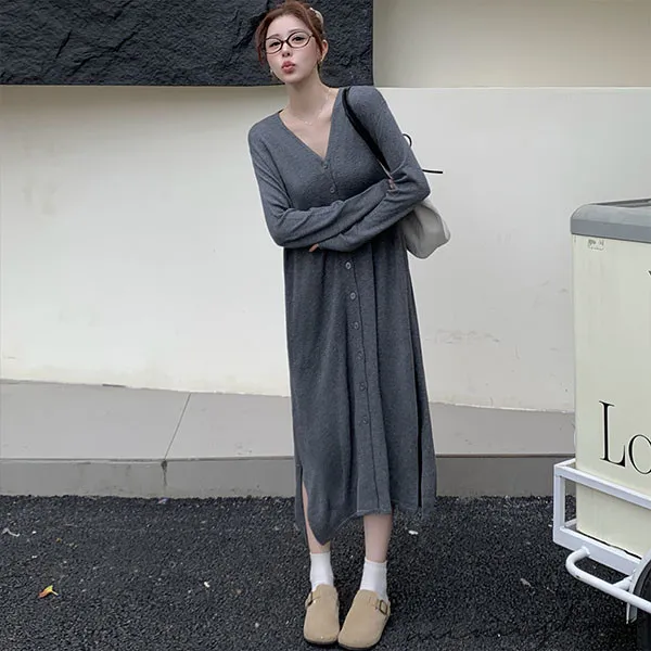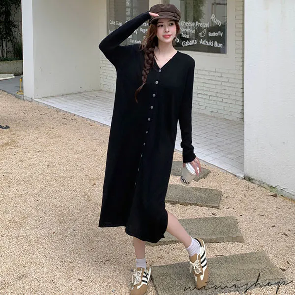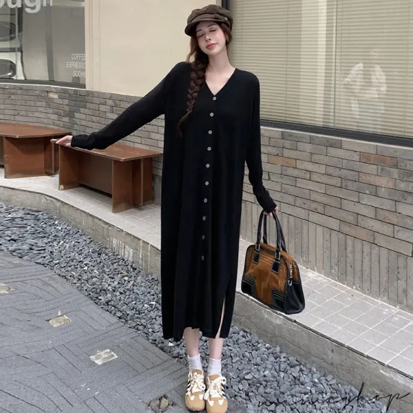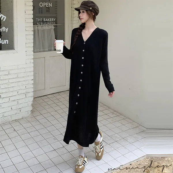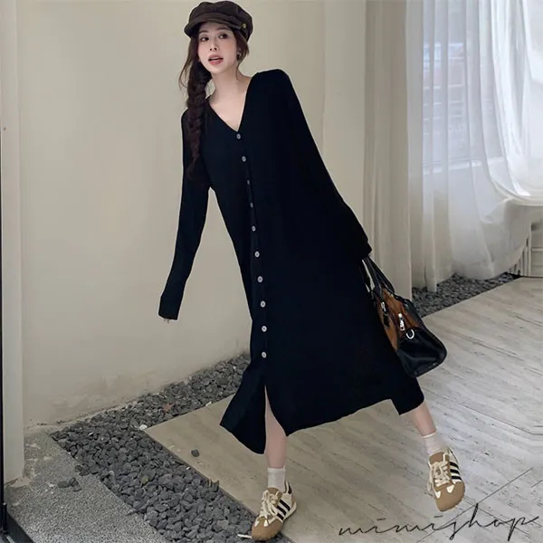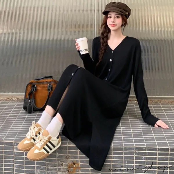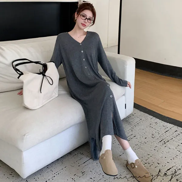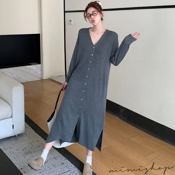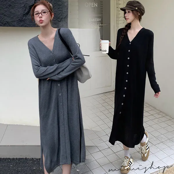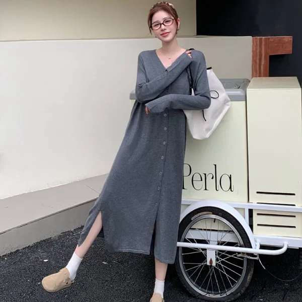 【P522323】簡約優雅 深v領排扣針織長裙 孕婦洋裝 不限孕期