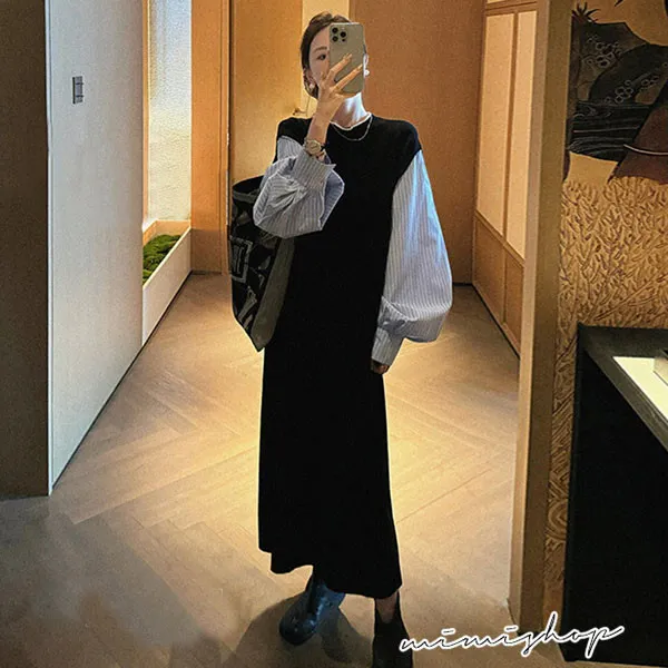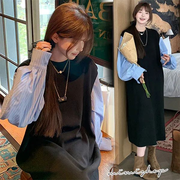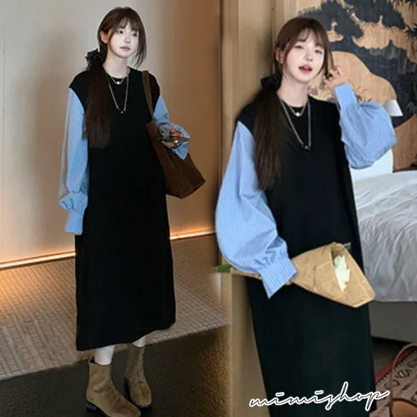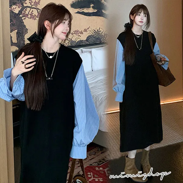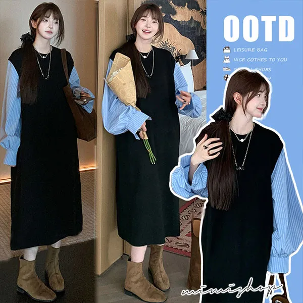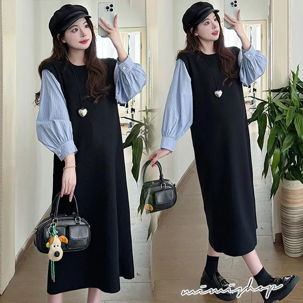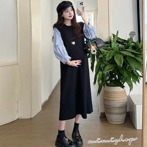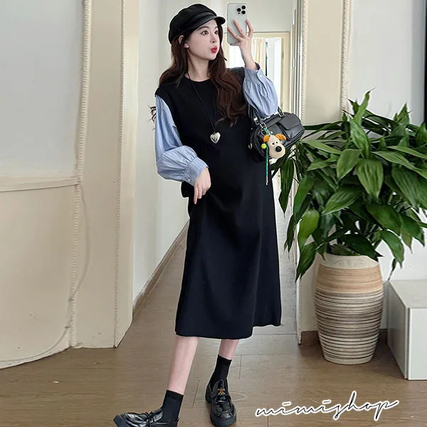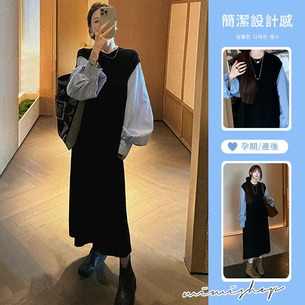 【P522327】簡潔設計感 假兩件襯衫針織連衣裙 孕婦洋裝 長裙