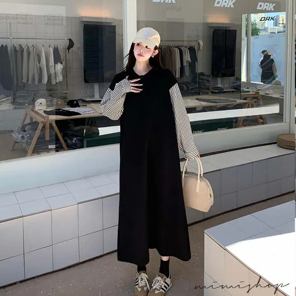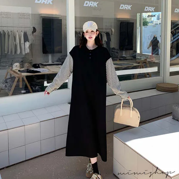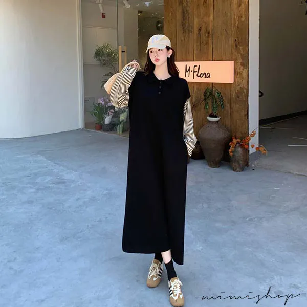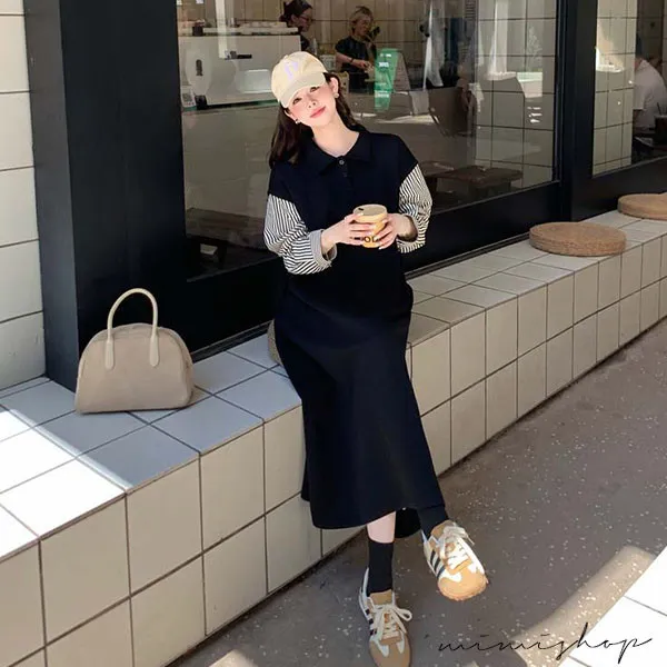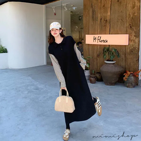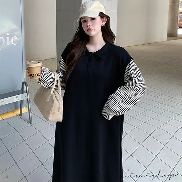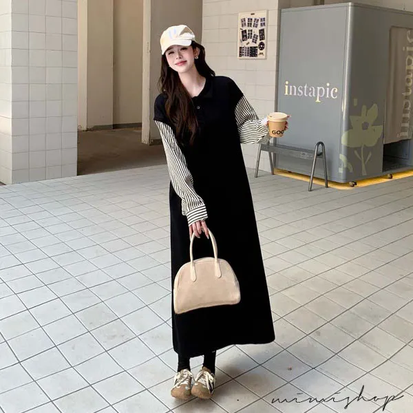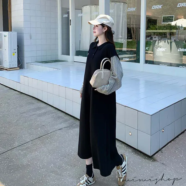 【P522340】輕鬆好質感 polo領拼接襯衫袖連身裙 孕婦洋裝 長裙