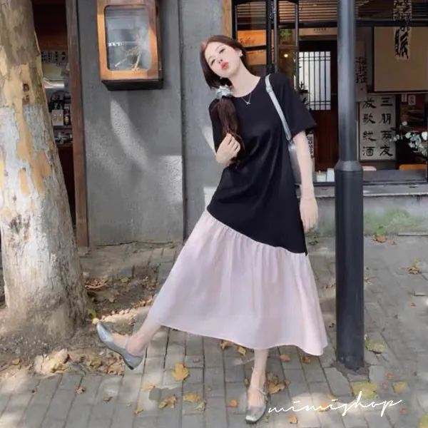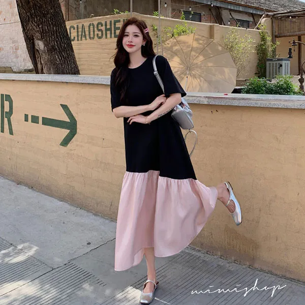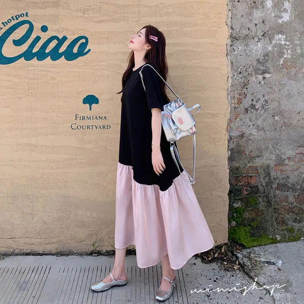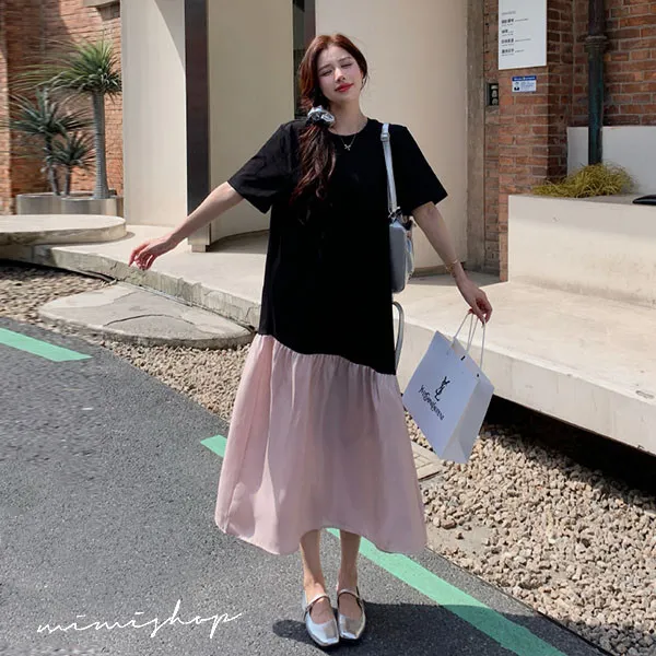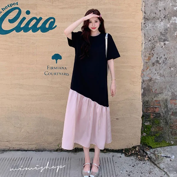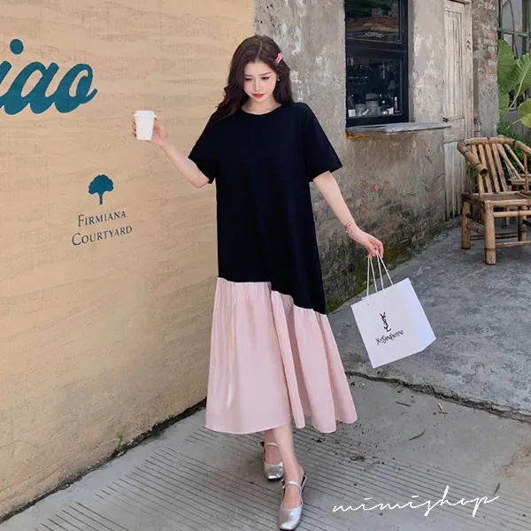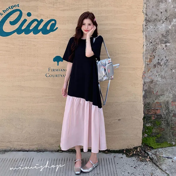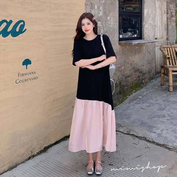 【P522352】浪漫旋律 黑粉撞色拼接寬版長洋裝 孕婦裙 不限孕期