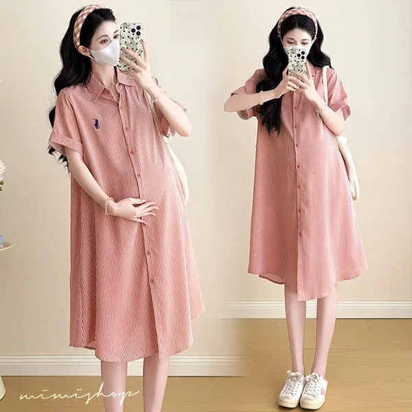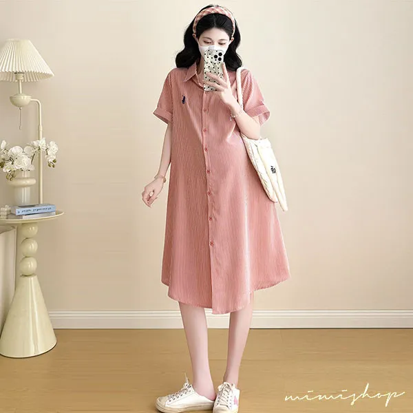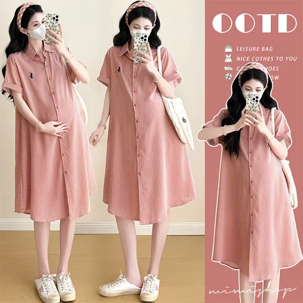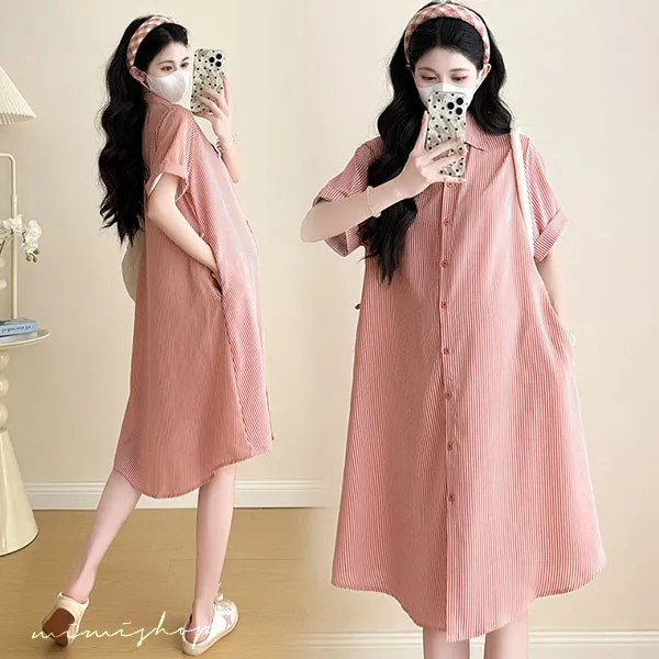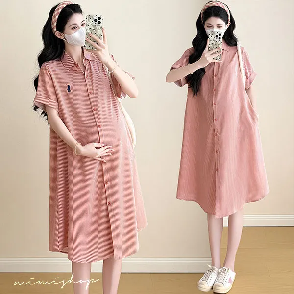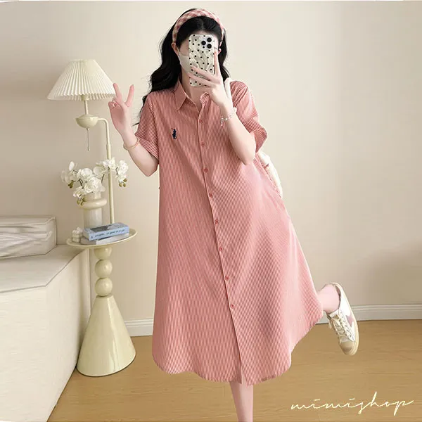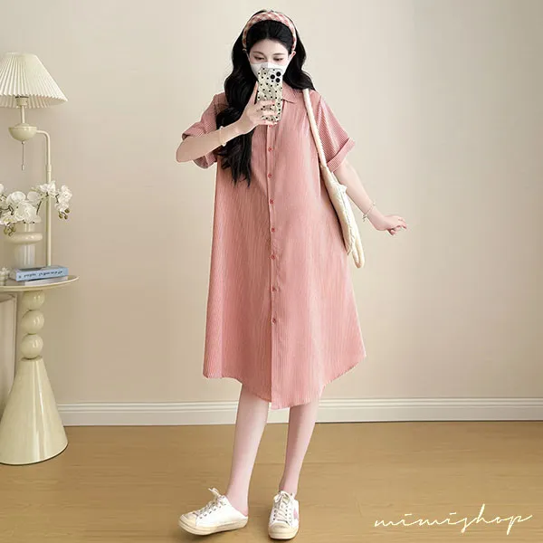 【P522360】質感日常 寬版條紋口袋襯衫裙 孕婦裙 顯瘦休閒