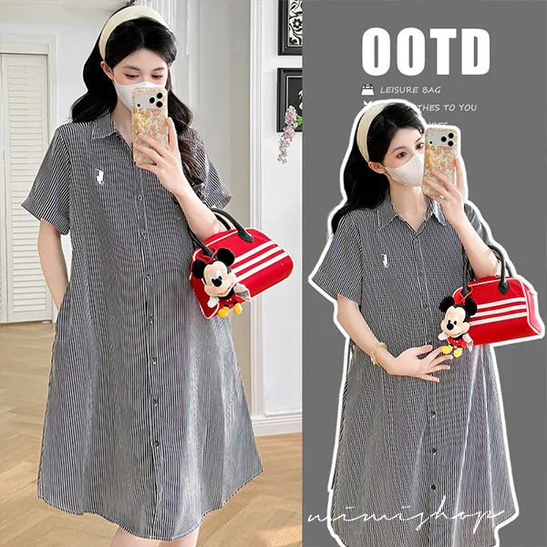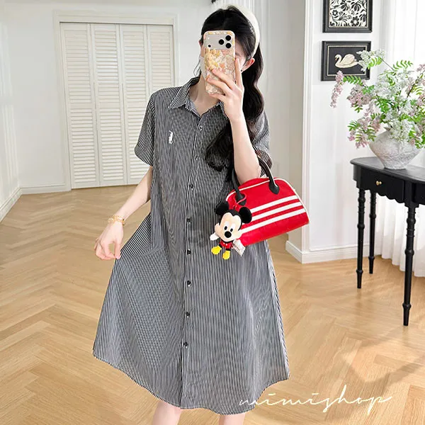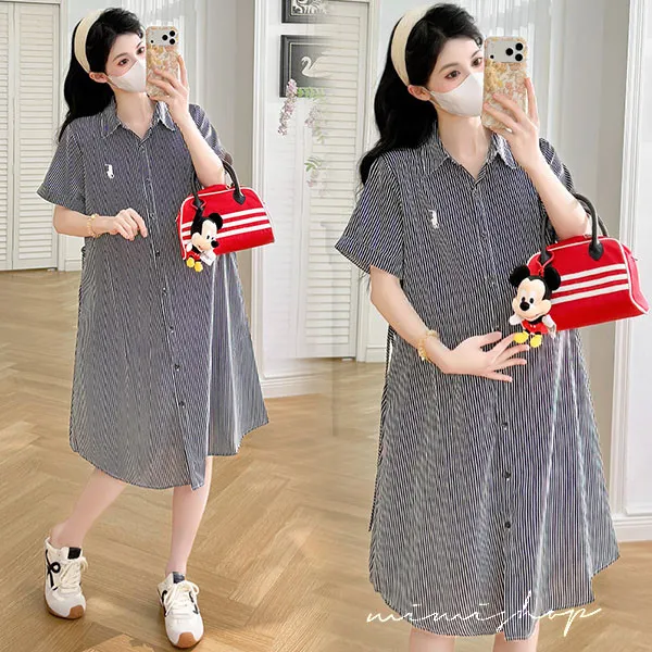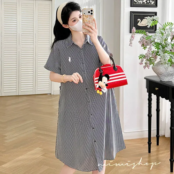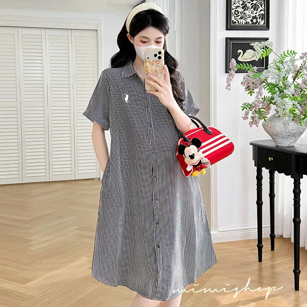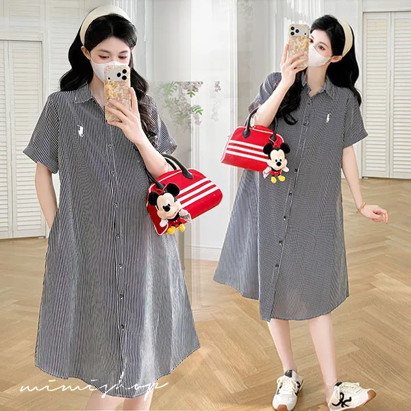 【P522365】質感日常 寬版條紋口袋襯衫裙 孕婦裙 顯瘦休閒