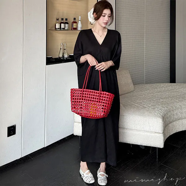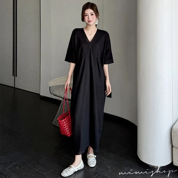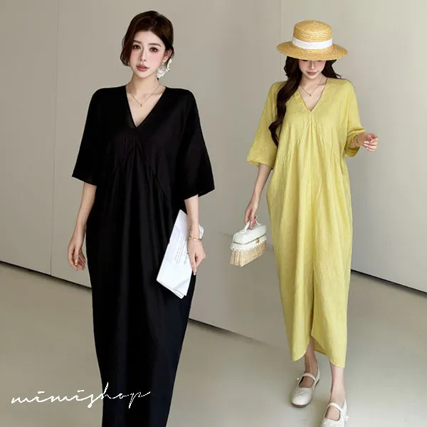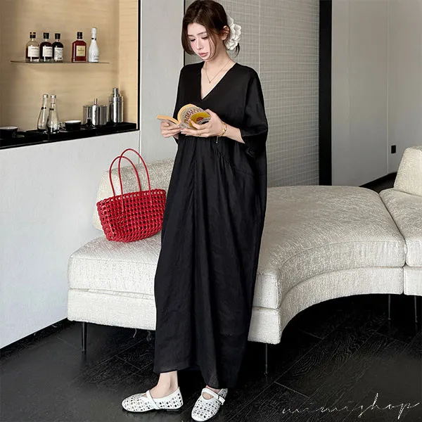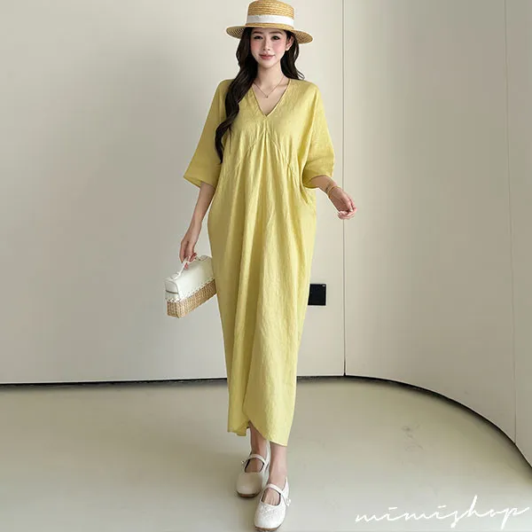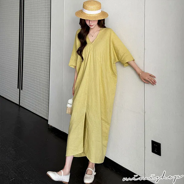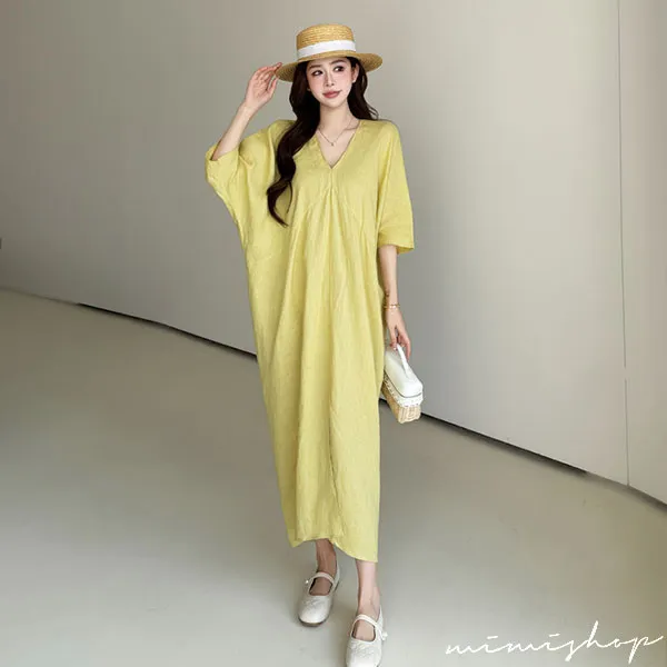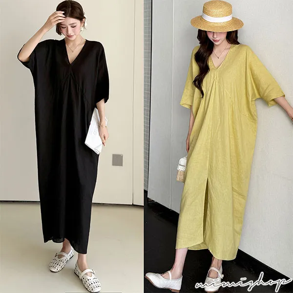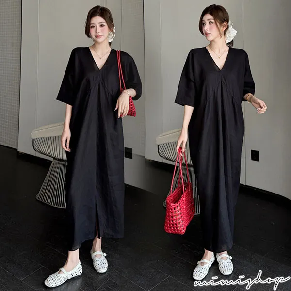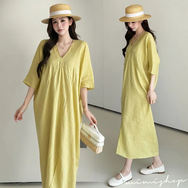 【P522368】南法度假 v領開衩設計 亞麻感連身裙 孕婦洋裝 長裙