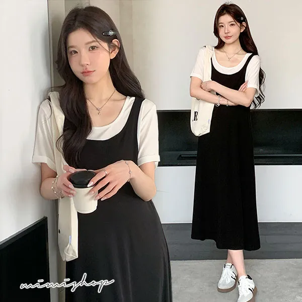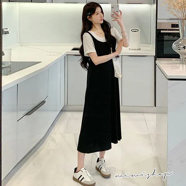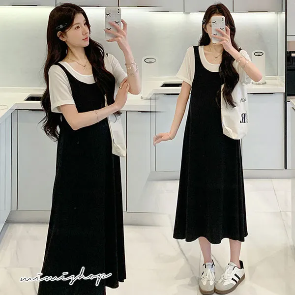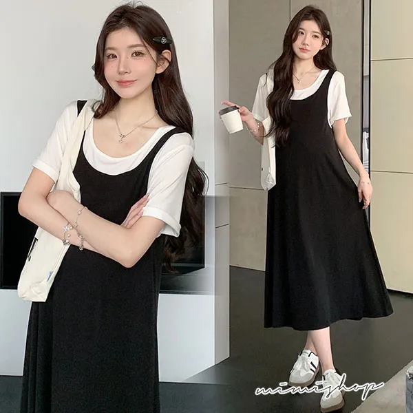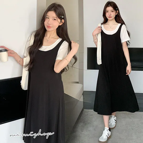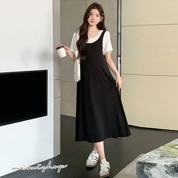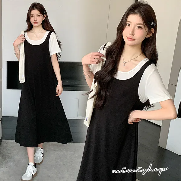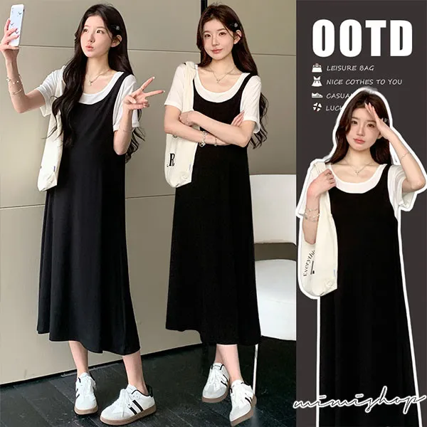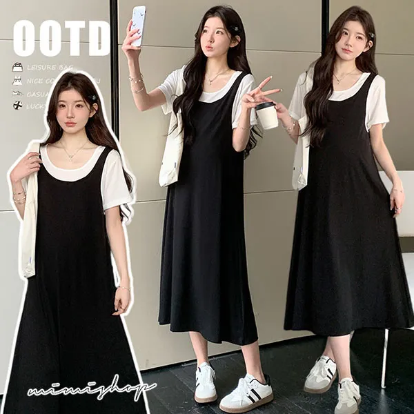 【P522370】懶媽咪必備 顯瘦假兩件涼感彈力連身裙 孕婦洋裝