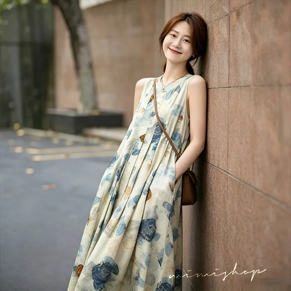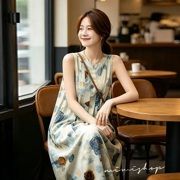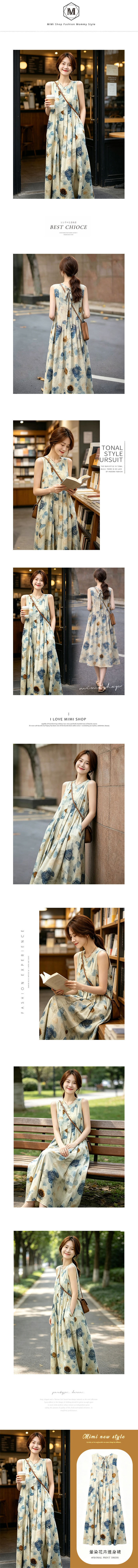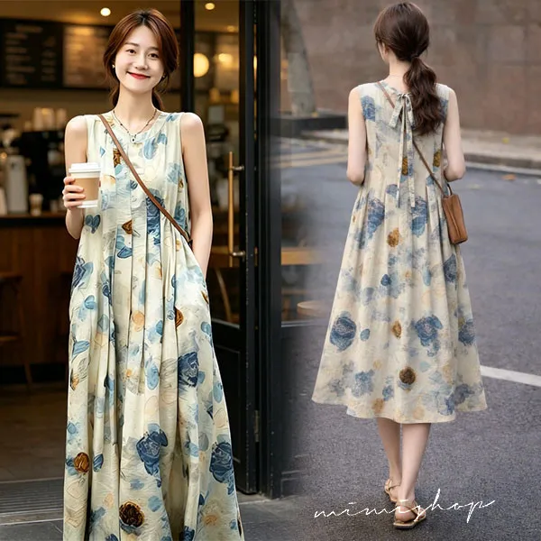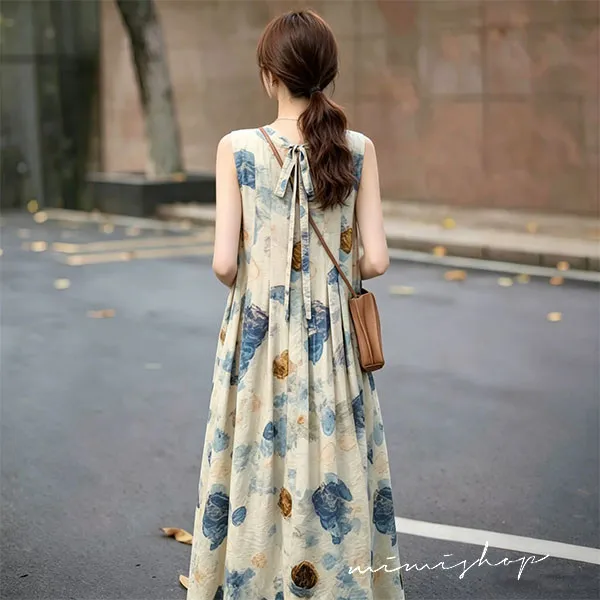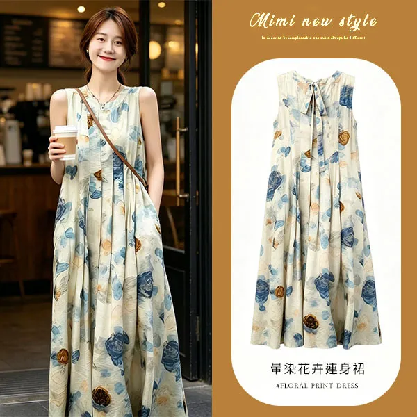 【P522373】油畫詩篇 暈染花卉後綁帶背心裙 寬鬆長裙 孕婦洋裝