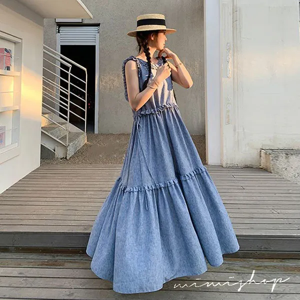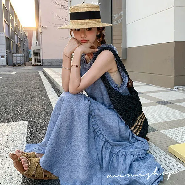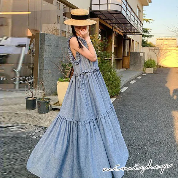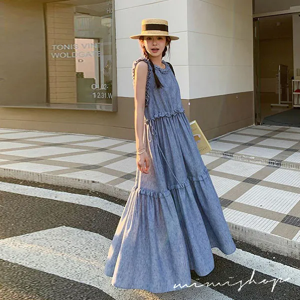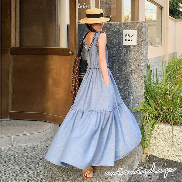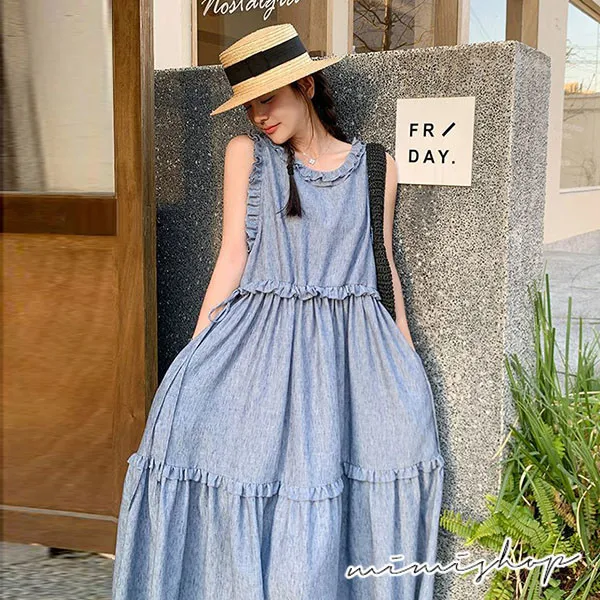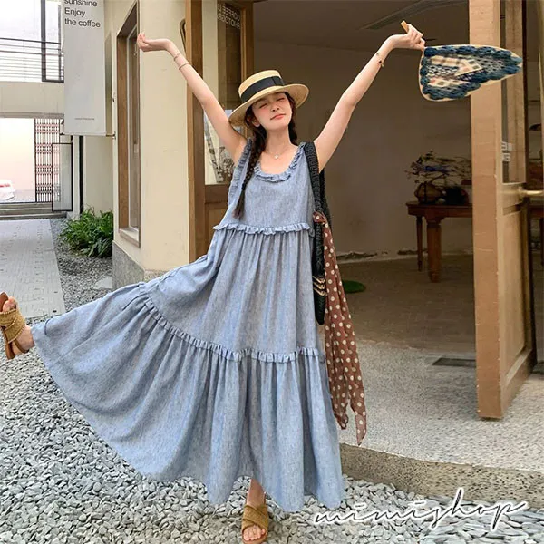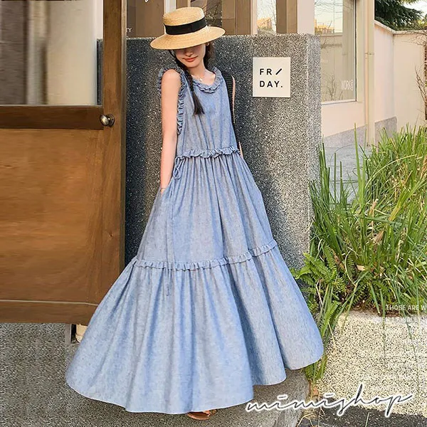 【P522374】海鹽蘇打 藍色木耳邊寬鬆背心裙 長裙 孕婦洋裝