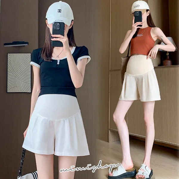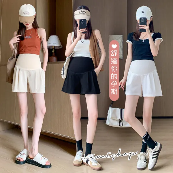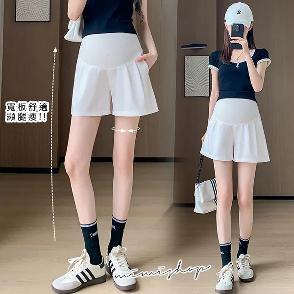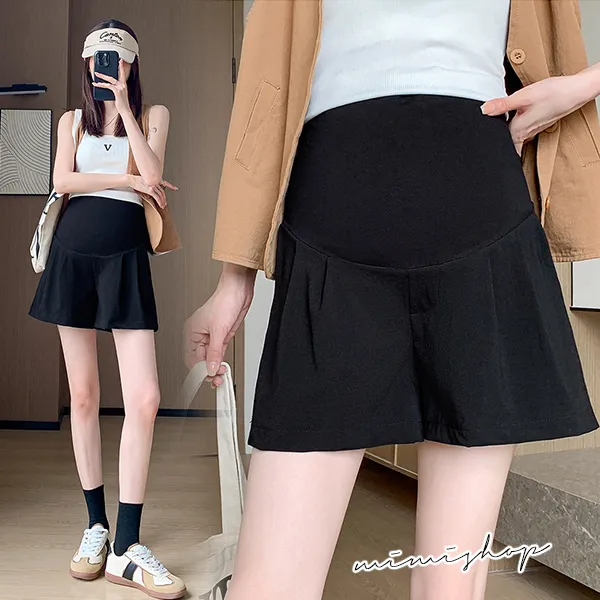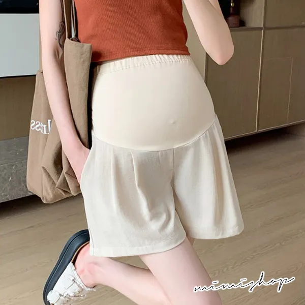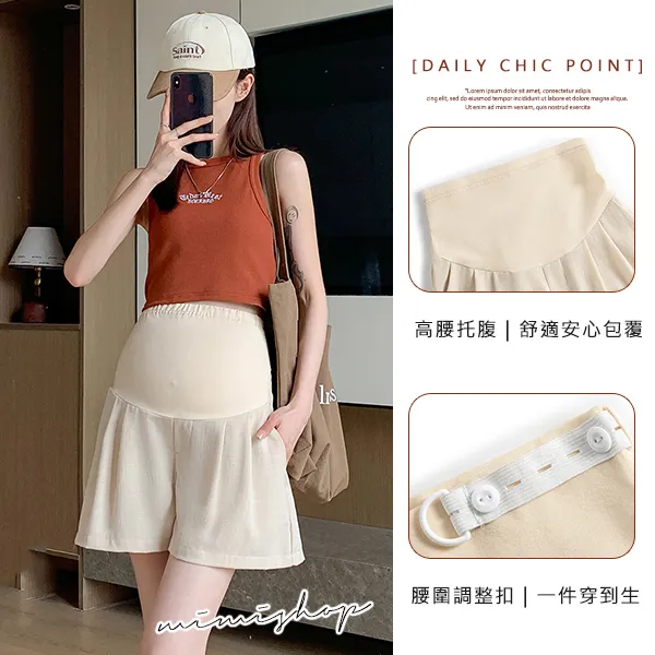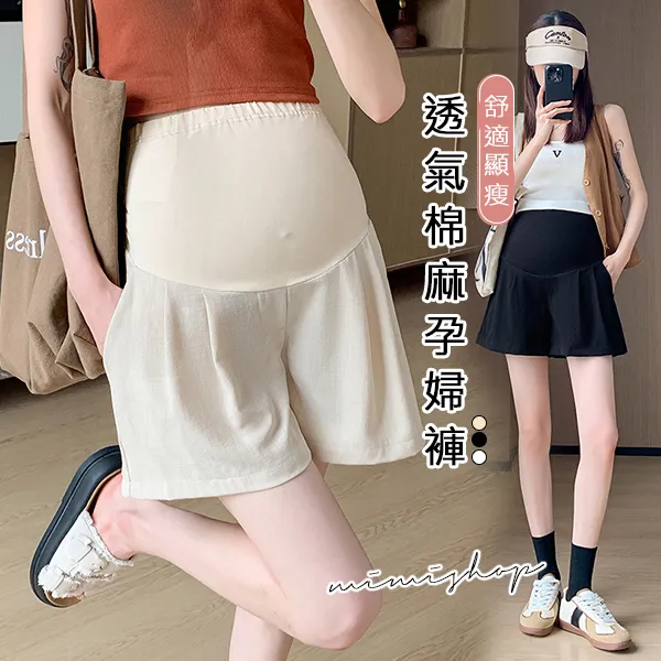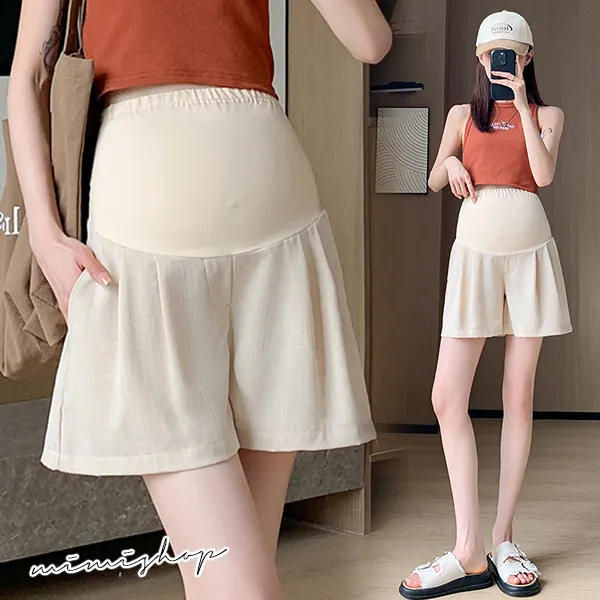 【P62264】百搭必備 寬版口袋抓褶短褲 透氣棉麻孕婦褲