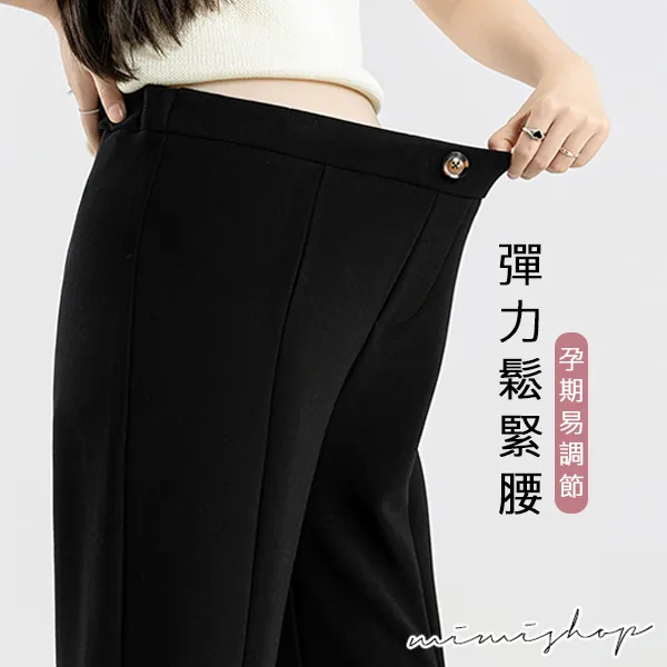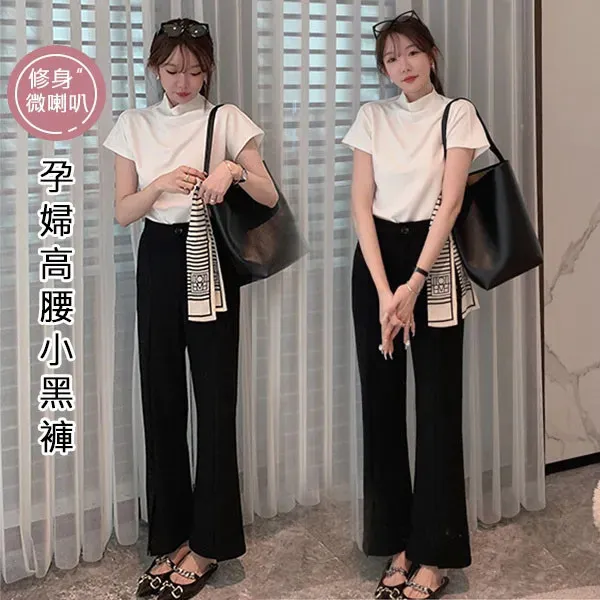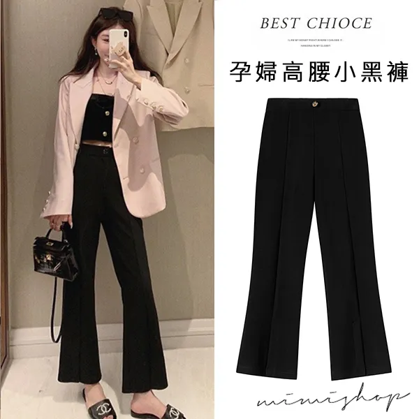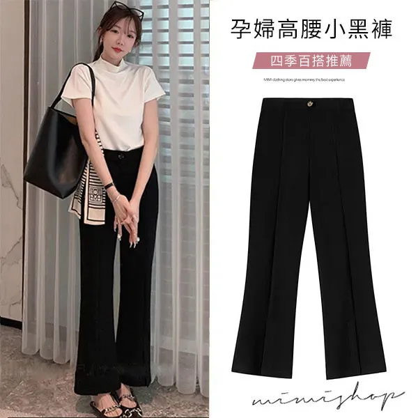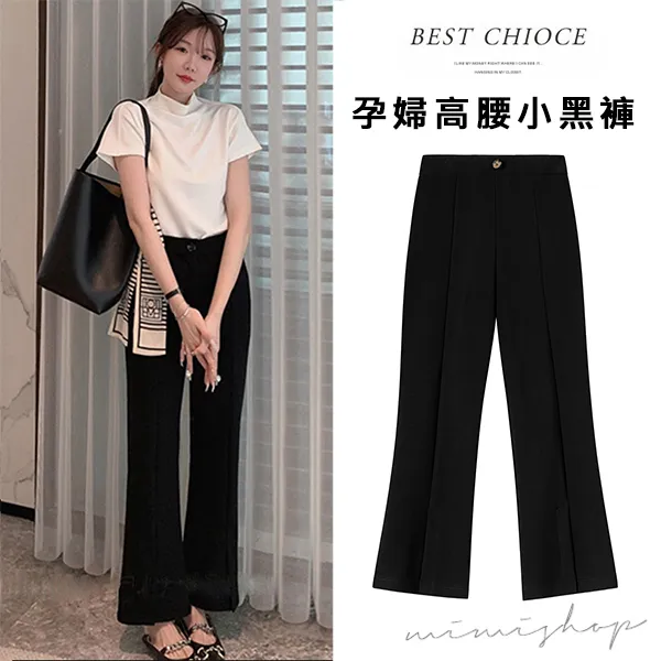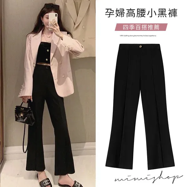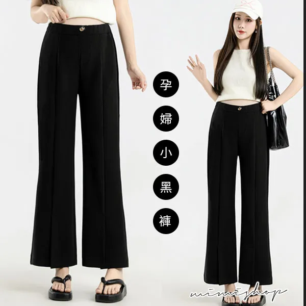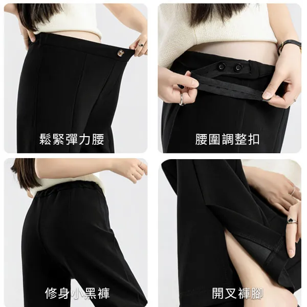 【P62315】四季百搭 修長微喇開叉褲 小黑褲 西裝褲 孕婦褲 彈力鬆緊腰