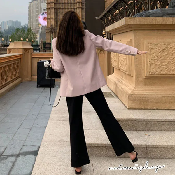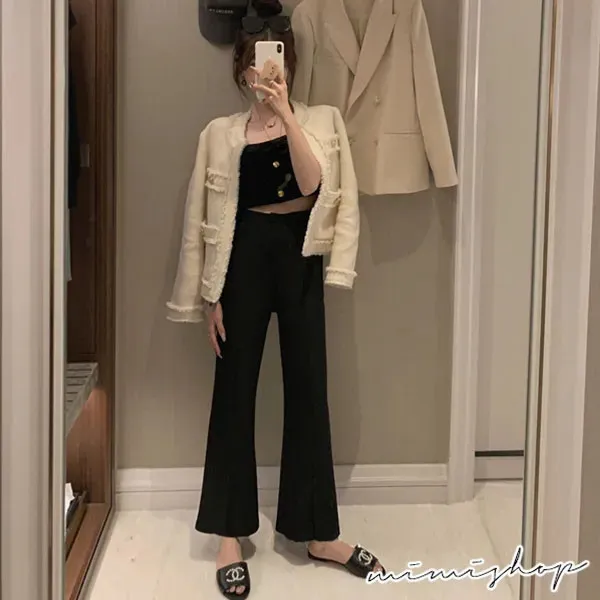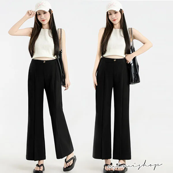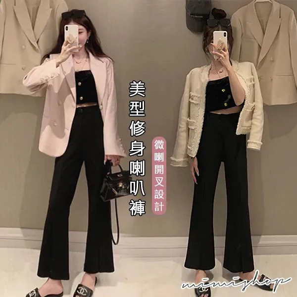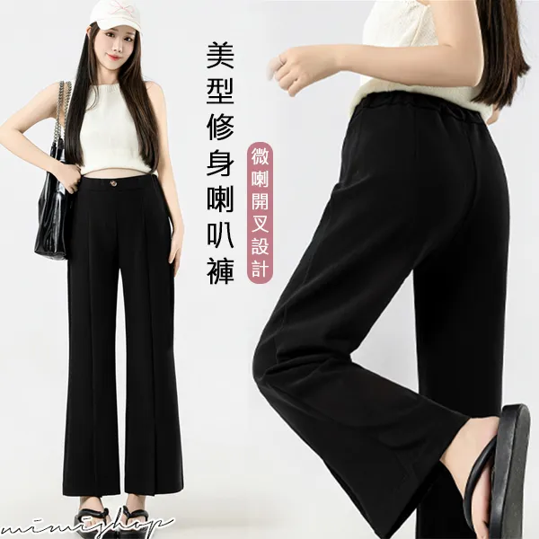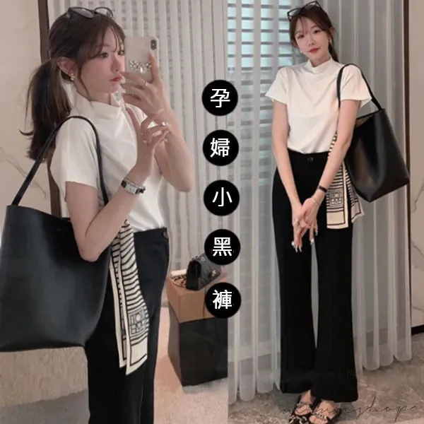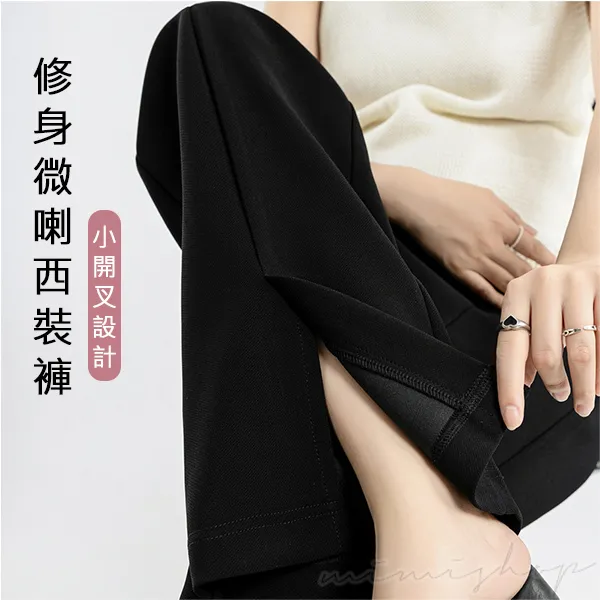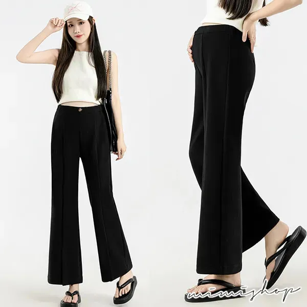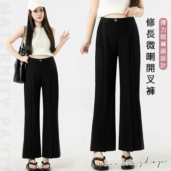 【P62315】四季百搭 修長微喇開叉褲 小黑褲 西裝褲 孕婦褲 彈力鬆緊腰