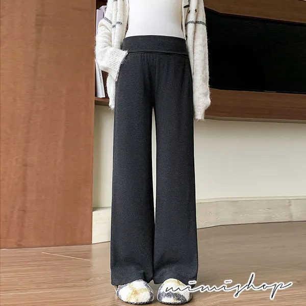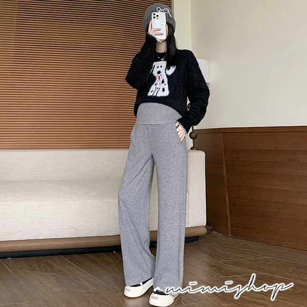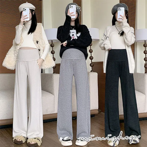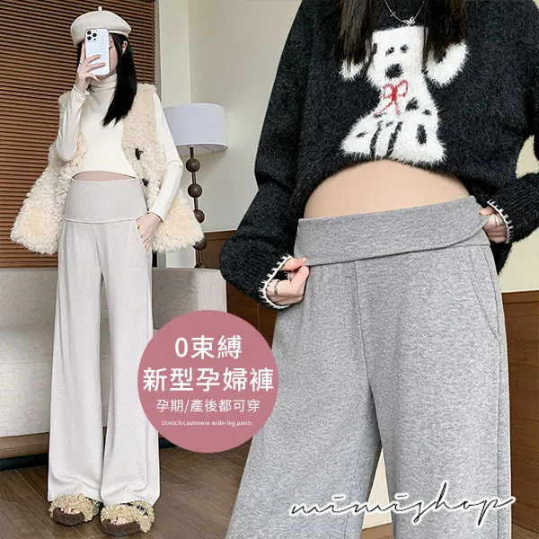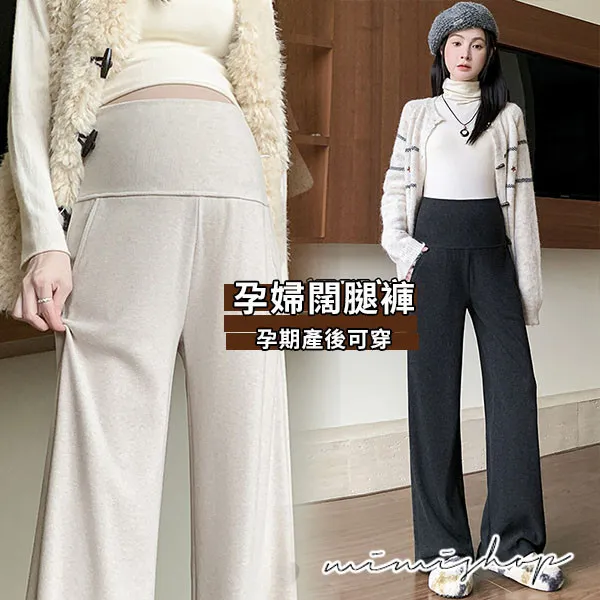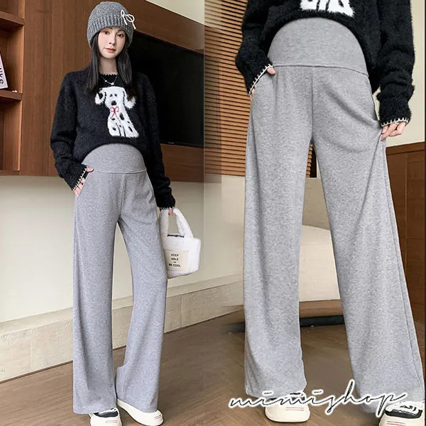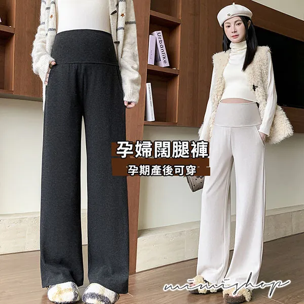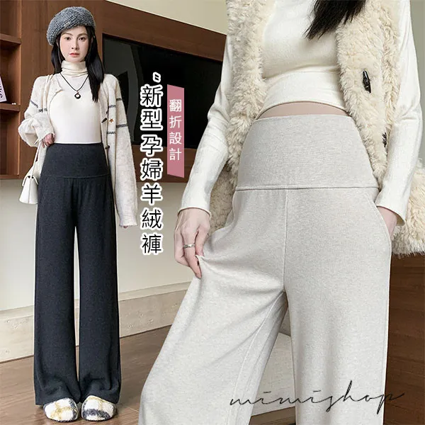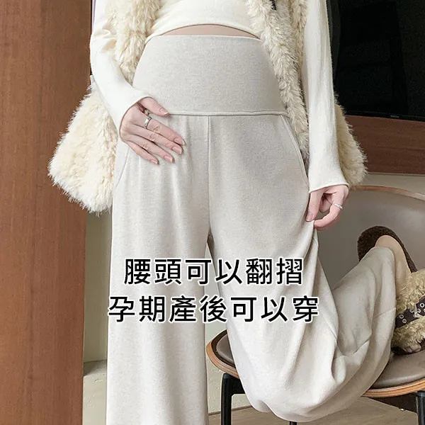 【P62433】零束縛 修長翻折設計 彈力羊絨寬褲 孕婦褲 不限孕期